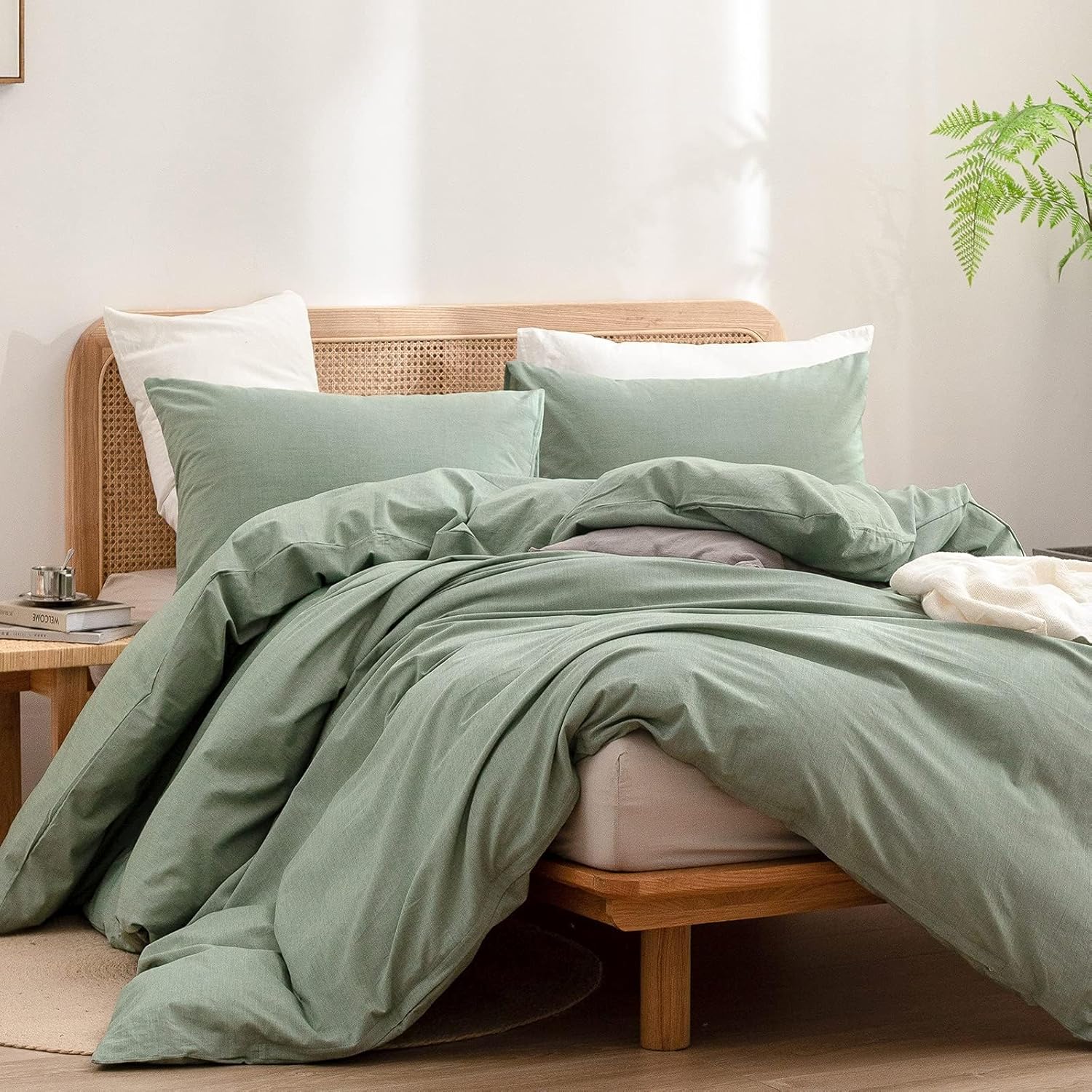 BESTOUCH Duvet Cover Set 100% Washed Cotton Linen Feel Super Soft Comfortable Chic Lightweight 3 PCs Home Bedding Set Solid Green Oversized Full