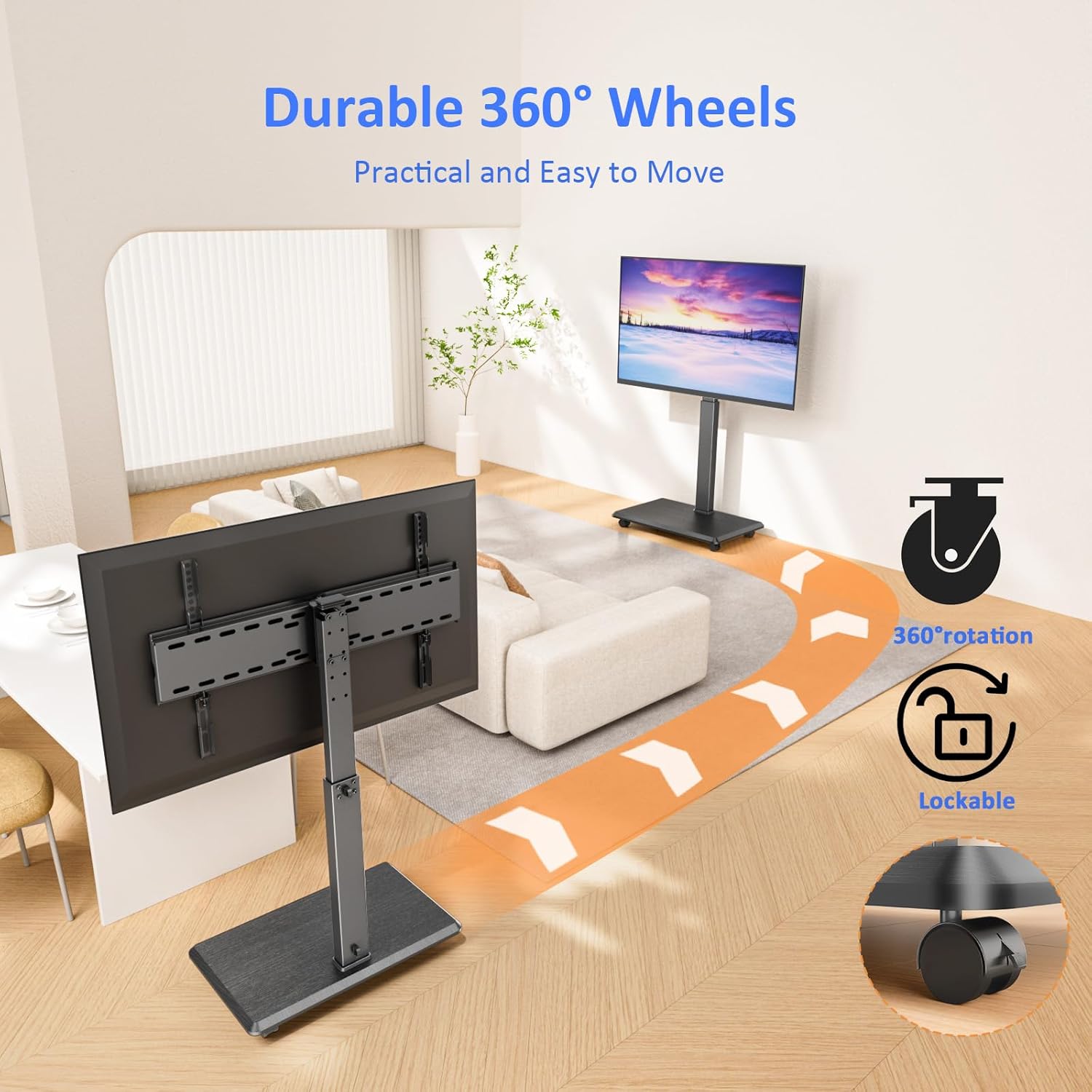 - 【18 Adjustable Heights & 30°Left and Right Swivel】The rolling tv stand can be adjusted to 18 different heights. It is designed with 3 TV bracket heights, 3 support rod heights, and 2 TV panel heights. In addition, it has swivel function of ±30° left and right, so it allows you to choose the most comfortable viewing angle.