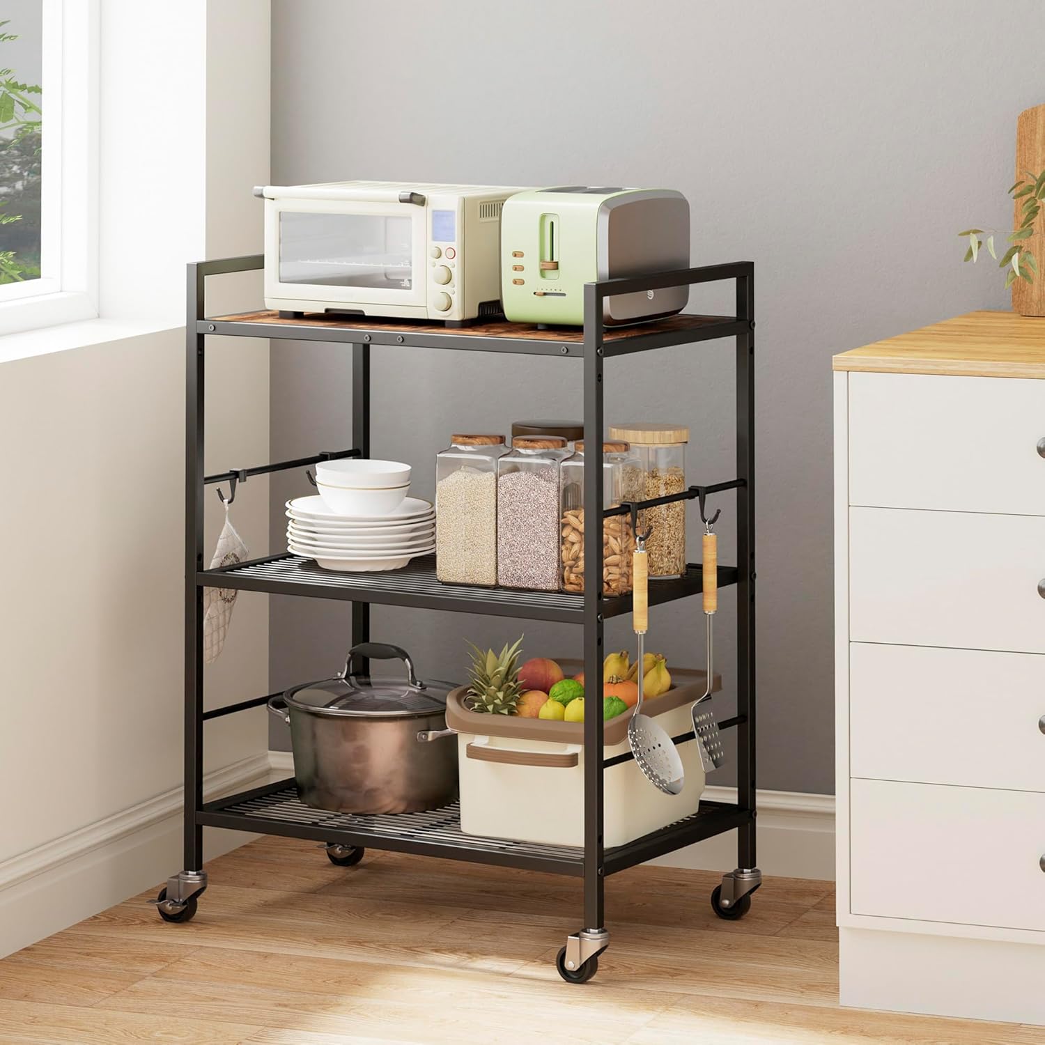 3-Tier Metal Storage Rack with Industrial Wheels,Mesh Shelving Unit with Wooden Table top,Adjustable Shelf,23.6-Inch Width,15.8-Inch Depth, for Kitchen, Laundry,Pantry,Plant,Black