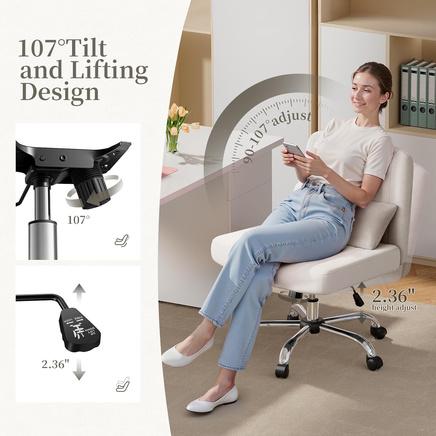 - [Free Adjustment and Movement]---The seat height can be adjusted from 18.9" to 21.26" to meet different needs. Also, you can tilt backward (90-107°) to relax. This velvet desk chair uses premium rotating caster wheels, it slides smoothly and silently across the carpet and hard floors. Our sleek armless desk chair boasts a compact footprint, easily tucking under desks to save valuable space. Ideal for home offices, bedrooms, or studies, it offers functionality without sacrificing style.