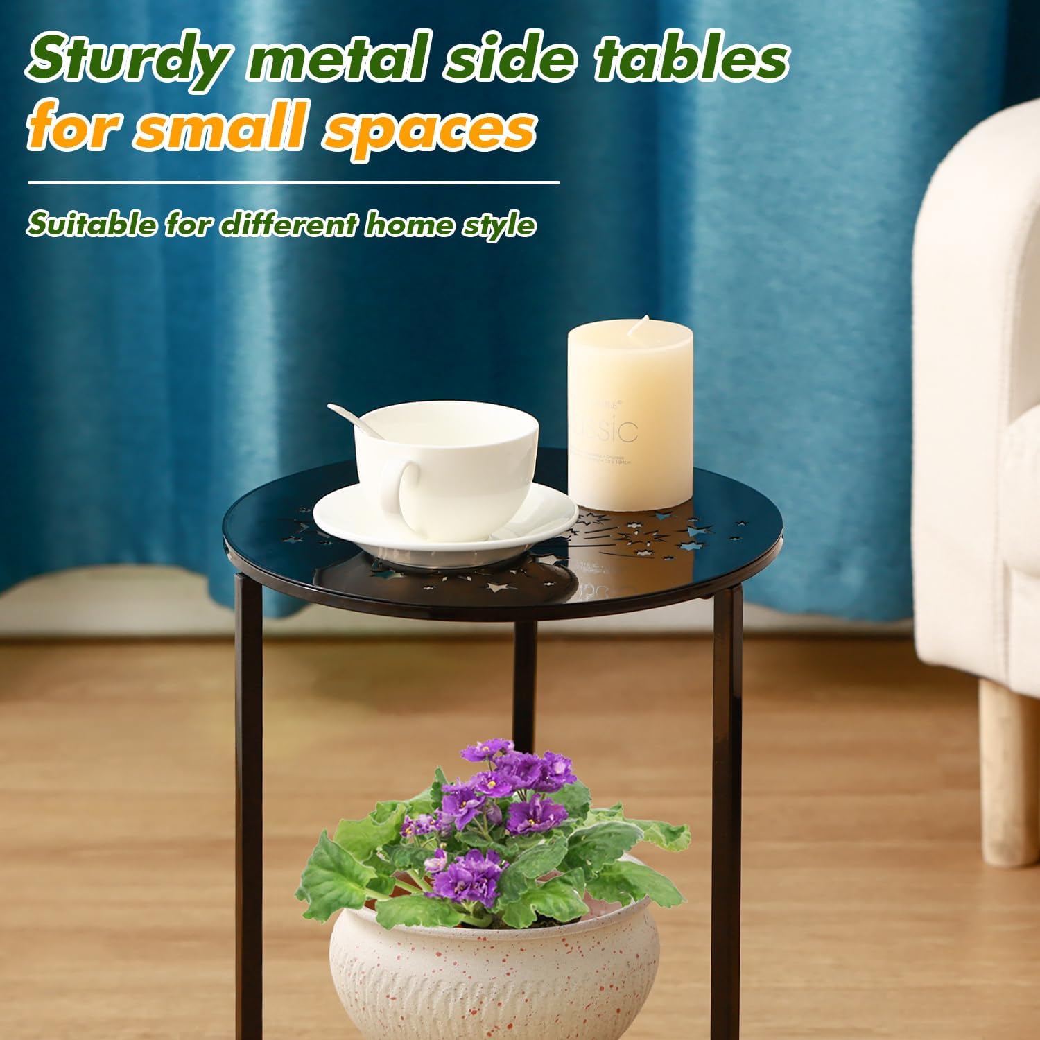 2 Packs 13" Metal Outdoor Side Tables Small Black Outside End Table for Patio Round Accent Corner Stand for Small Spaces Weather-Resistant Coffee Table for Balcony Porch Plant Stand, Starlight