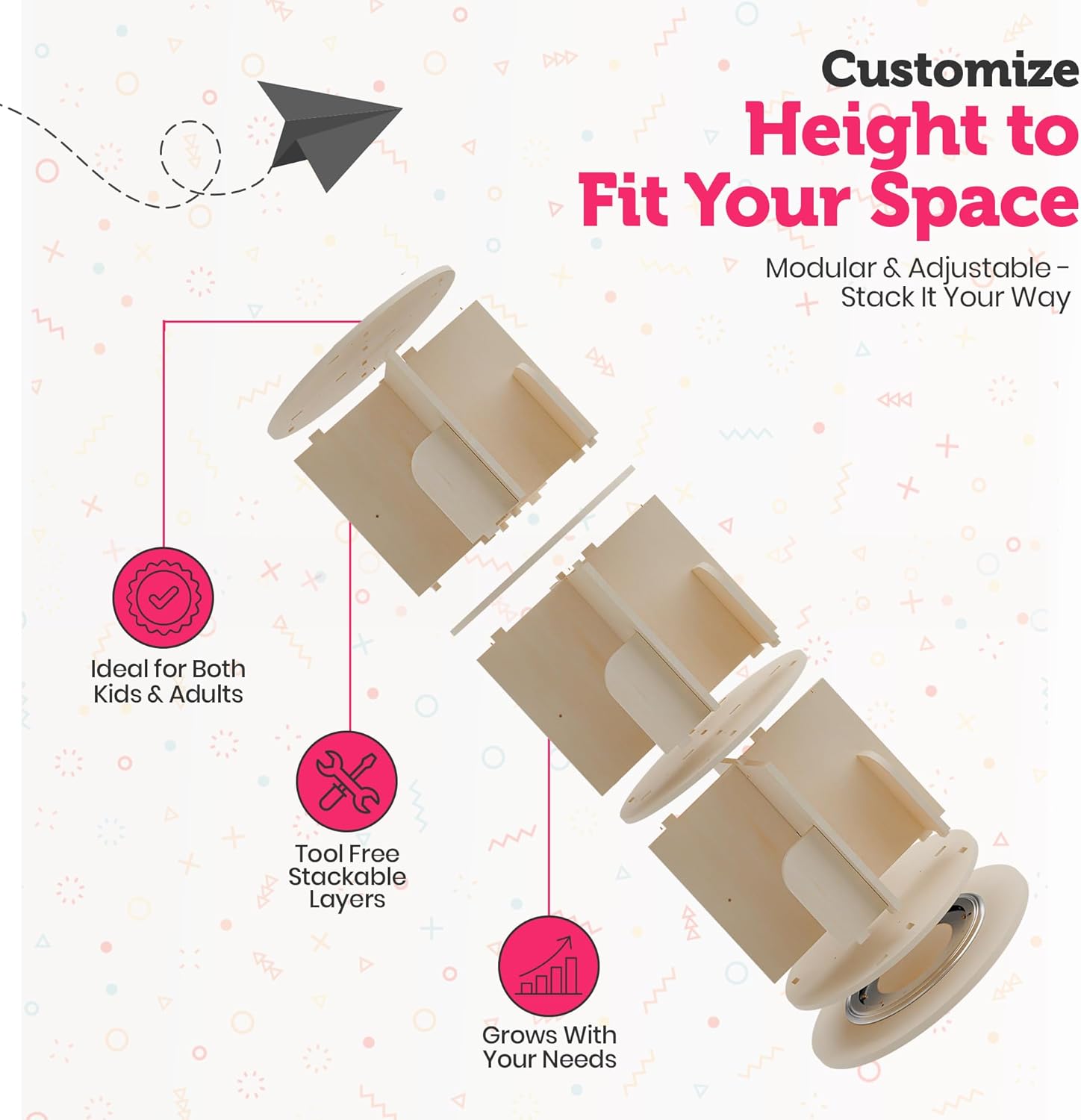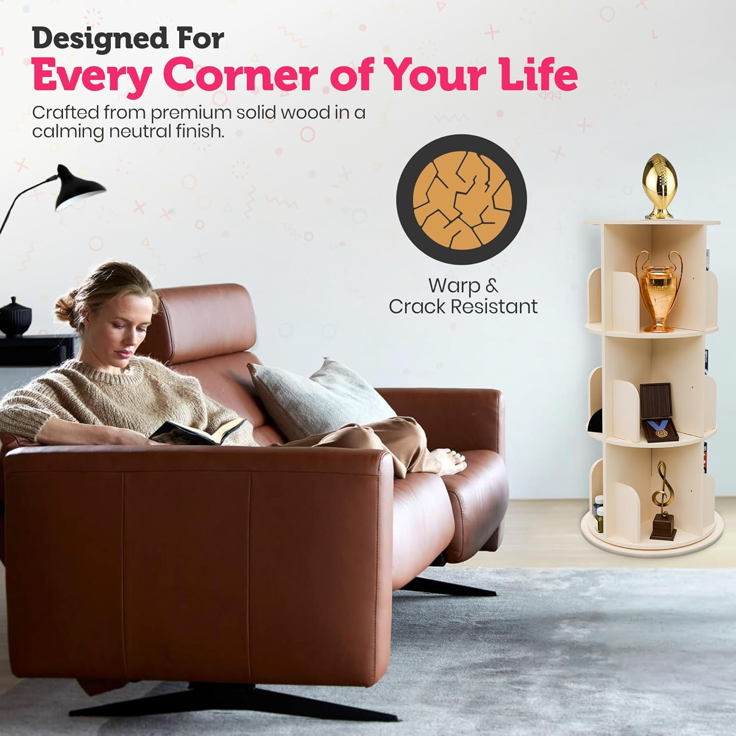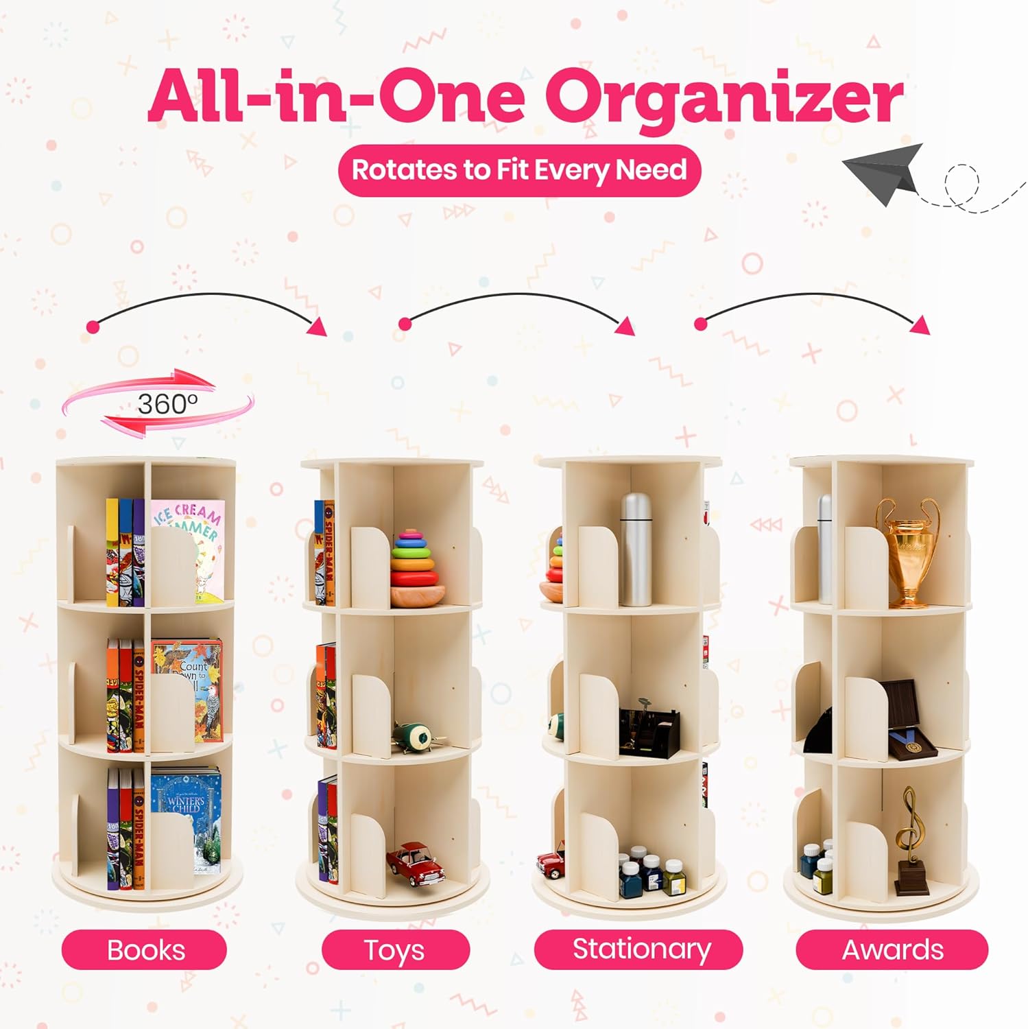 Rotating Kids Bookshelf – 3-Tier 360° Spinning Bookcase Tower, Solid Pine Wood, 12 Cubbies, Toddler Bookshelf Organizer & Lazy-Susan Storage for Nursery, Classroom or Playroom (Natural Finish)