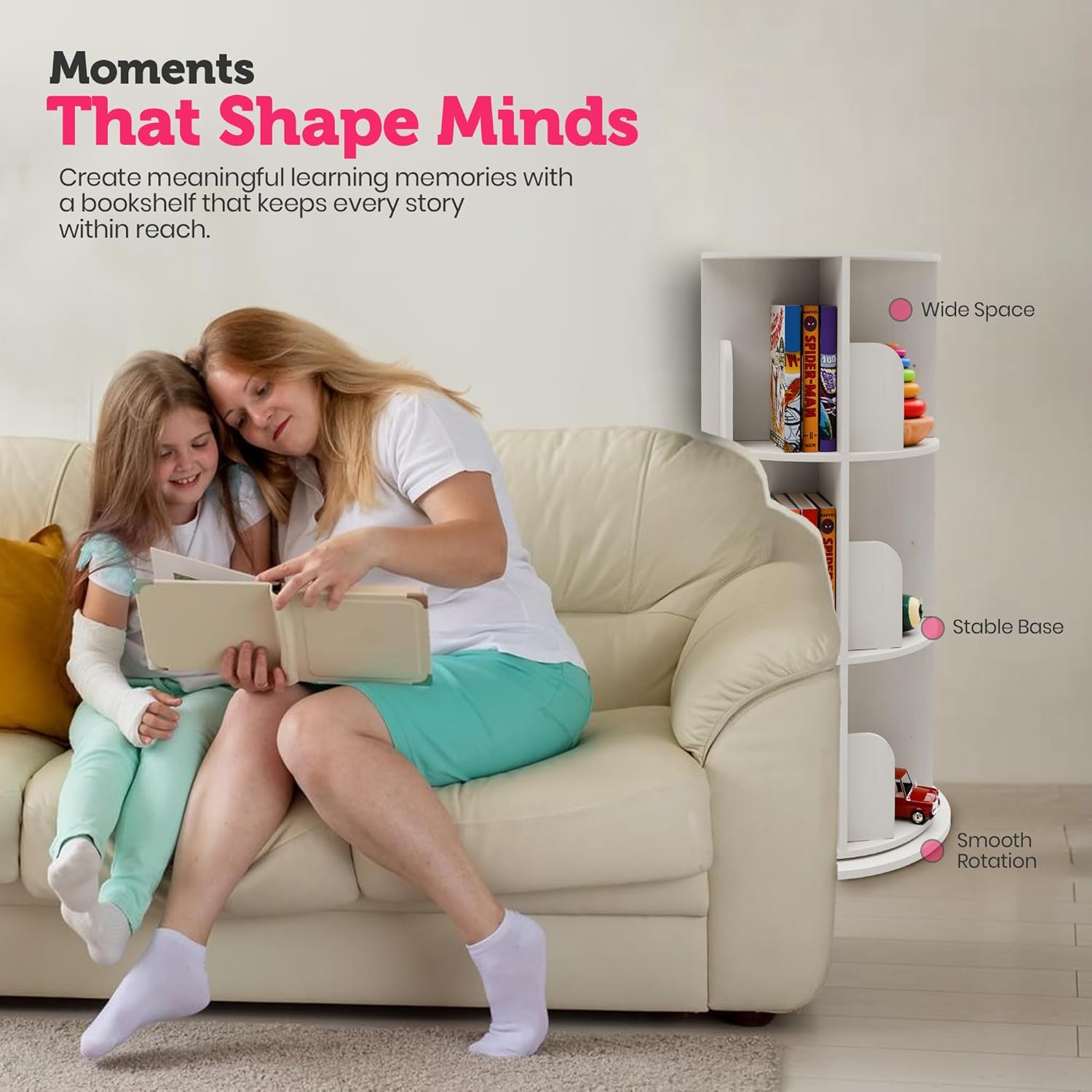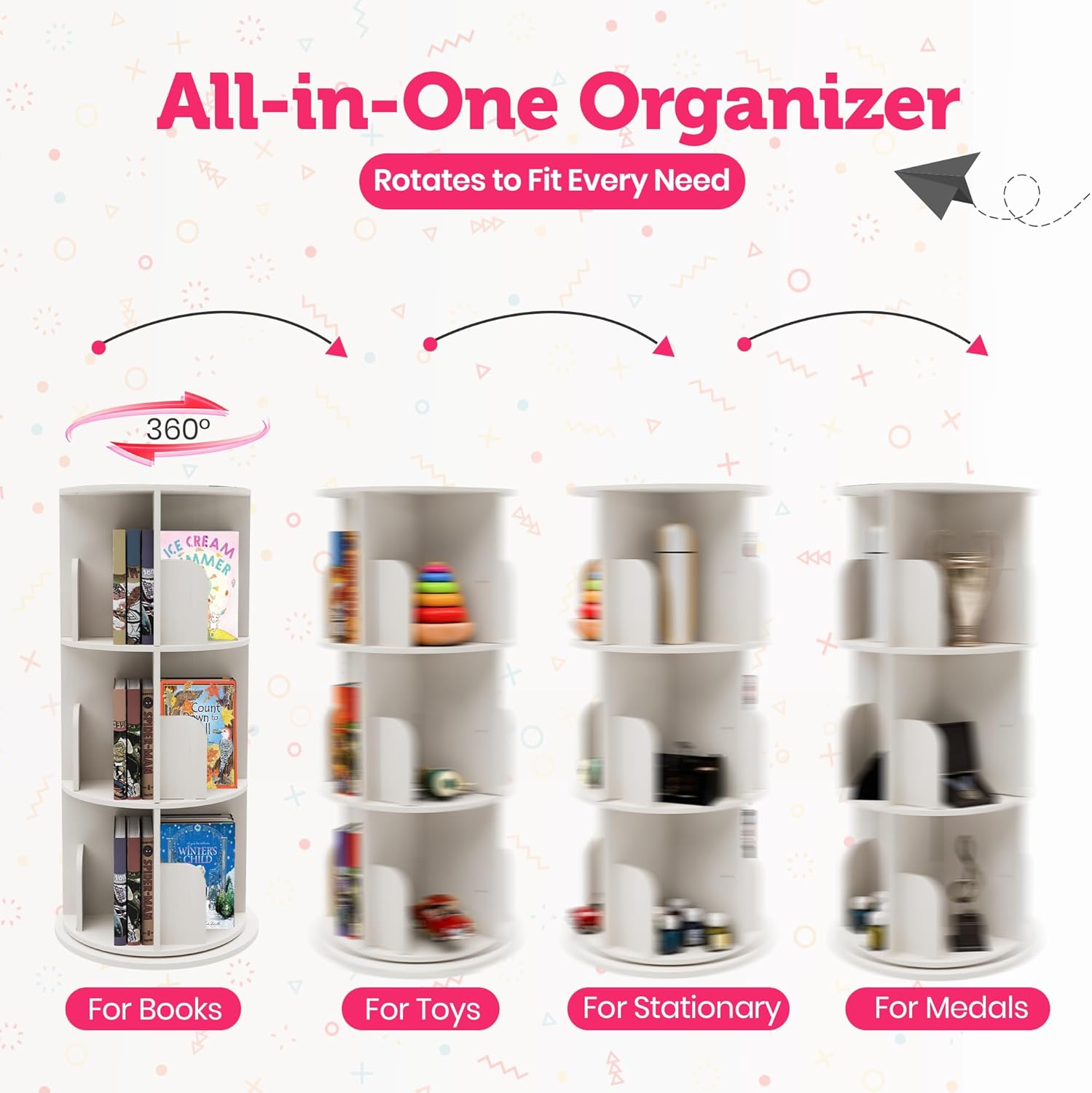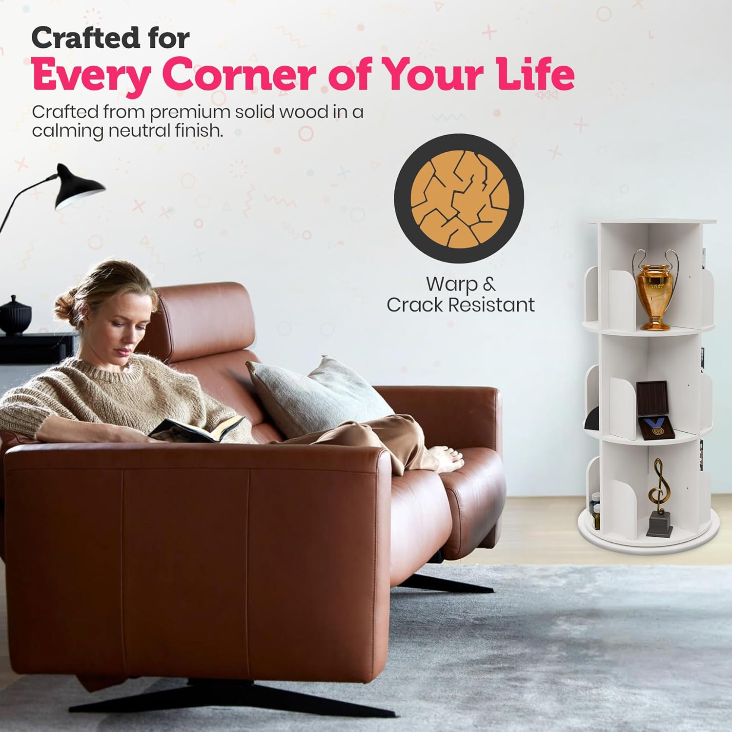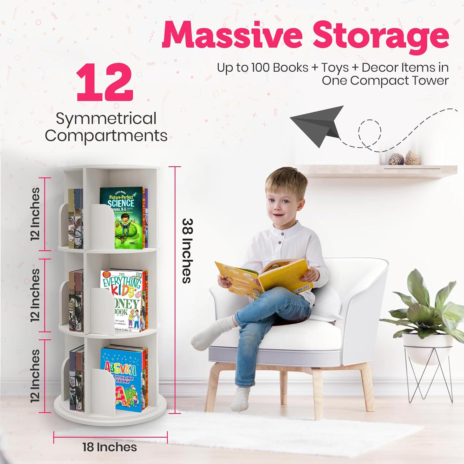 Rotating Kids Bookshelf – 3-Tier 360° Spinning Bookcase Tower, Solid Pine Wood, 12 Cubbies, Toddler Bookshelf Organizer & Lazy-Susan Storage for Nursery, Classroom or Playroom (White Finish)