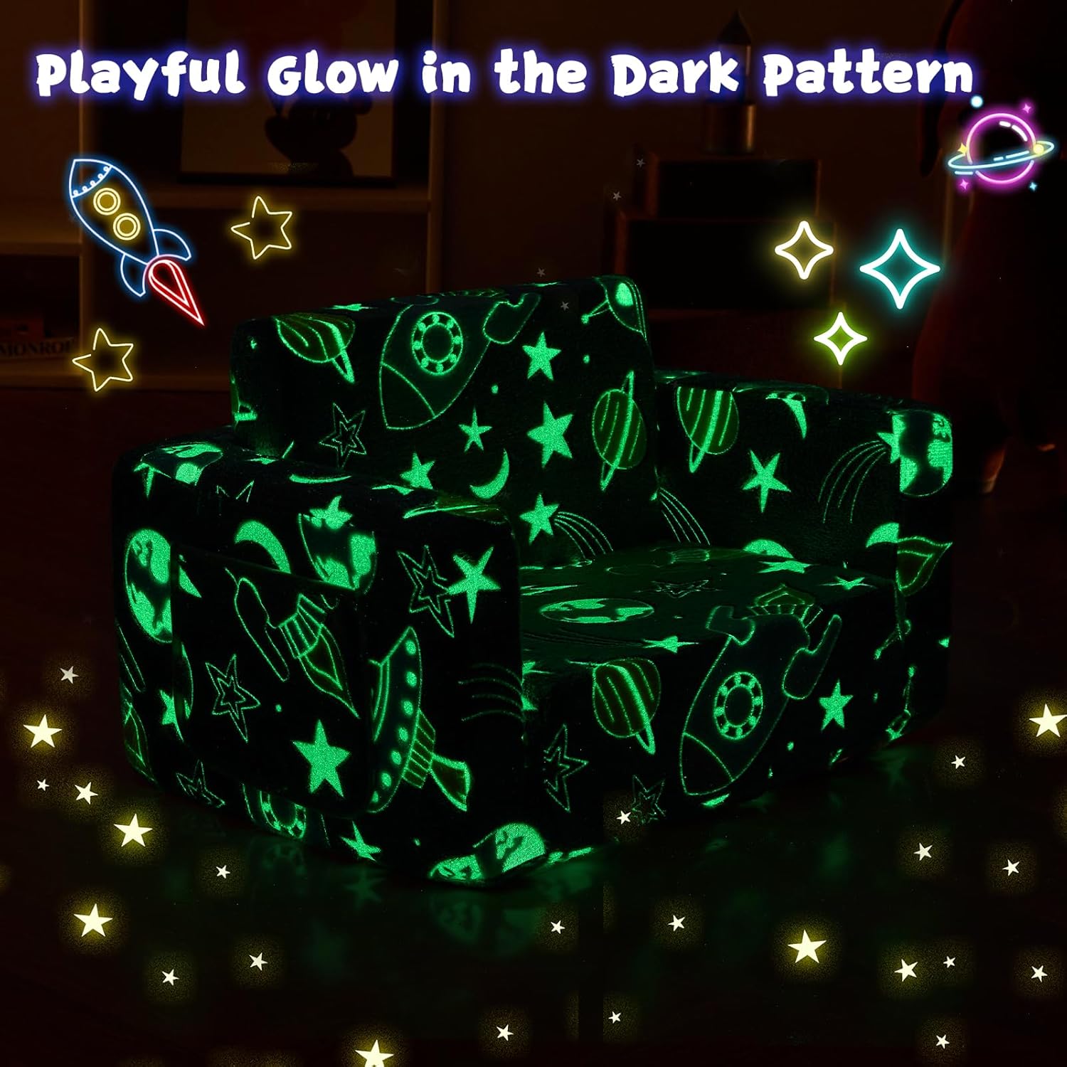 - 【Glow-in-the-Dark Space Adventure】Featuring rockets, planets, and twinkling stars, this foldable toddler sofa glows gently in the dark—transforming your child’s room into a galaxy of imagination. A perfect bedtime companion for little explorers and future astronauts