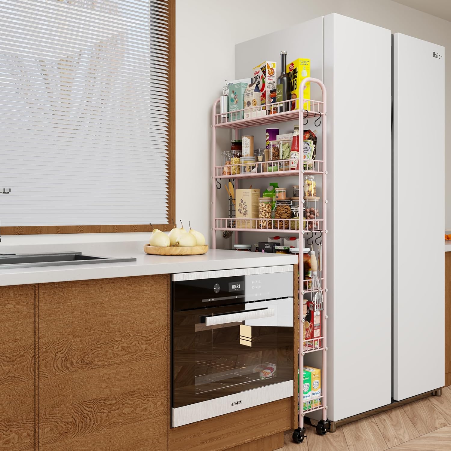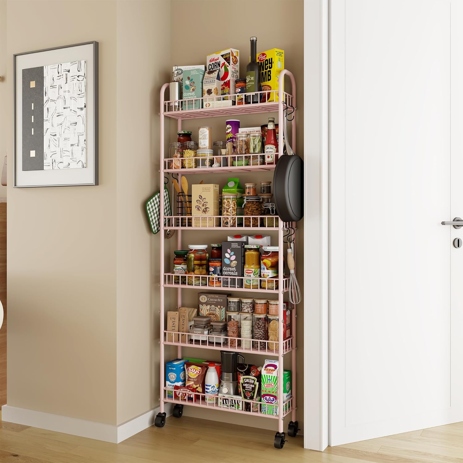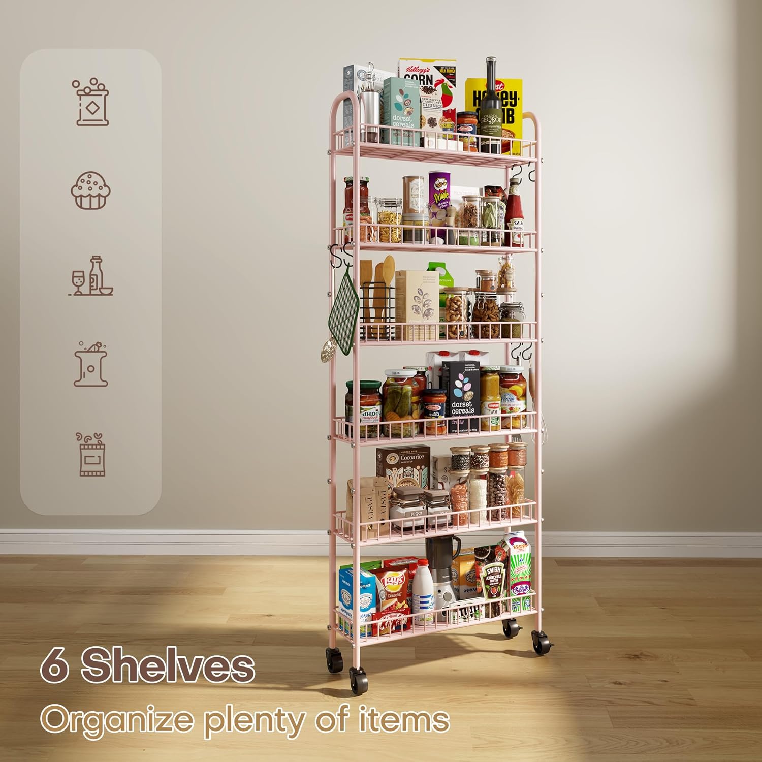 6 Tier Slim Rolling Storage Cart with Wheels, Metal Mobile Shelving Unit Organizer Utility Cart for Office Bathroom Kitchen Laundry Room Narrow Places (Pink 6 Inches)