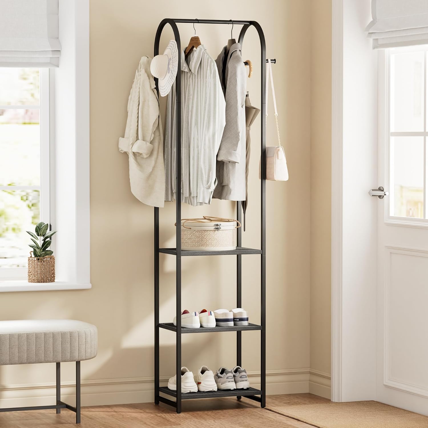 - All-in-One Clothes Organizer: Freestanding garment rack with 3 shelves, 4 hooks, and a hanging rod—perfect for hanging coats, organizing shoes, storing bags, or displaying plants.