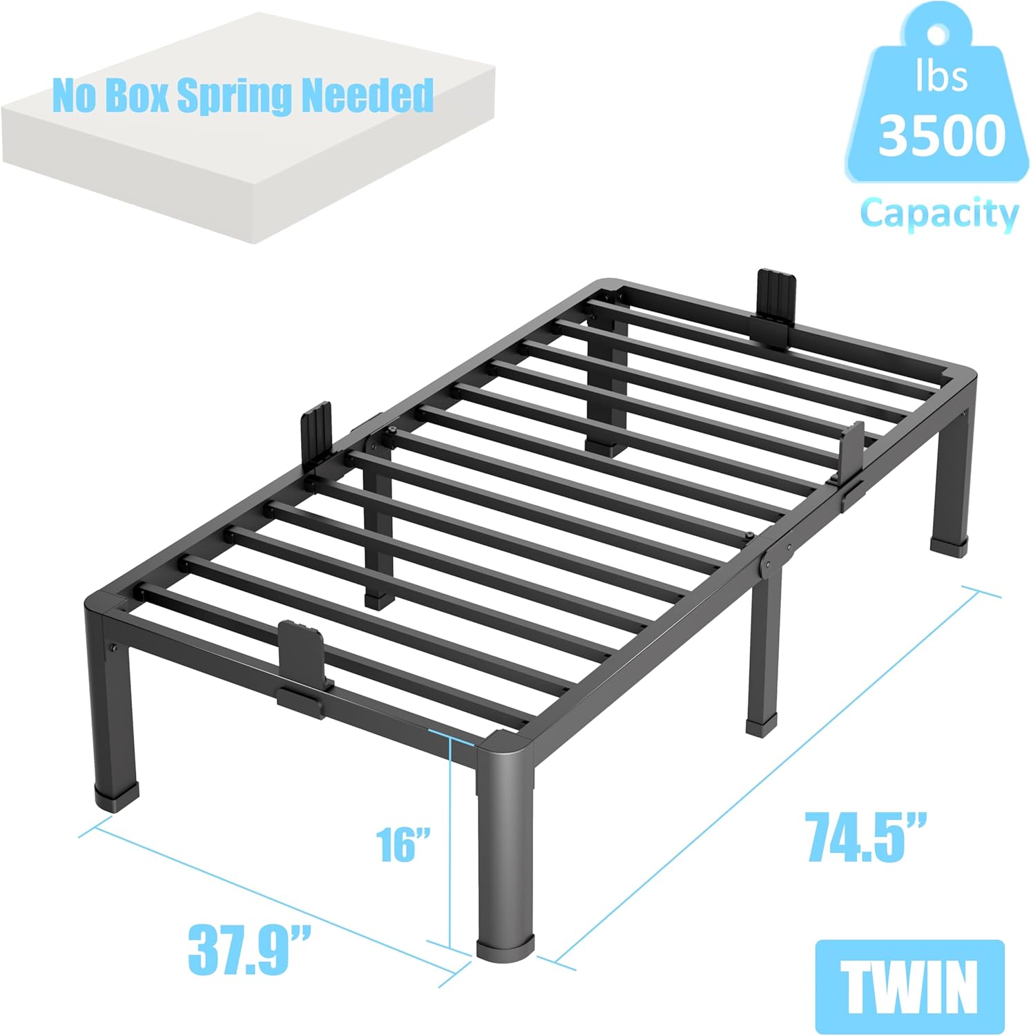 - Heavy Duty Bed Frame:The twin size bed frames is made of heavy duty steel strong enough to withstand 3500 lbs the metal twin bed frame is no squeak and comes with anti-scratch gaskets to protect your floor.
