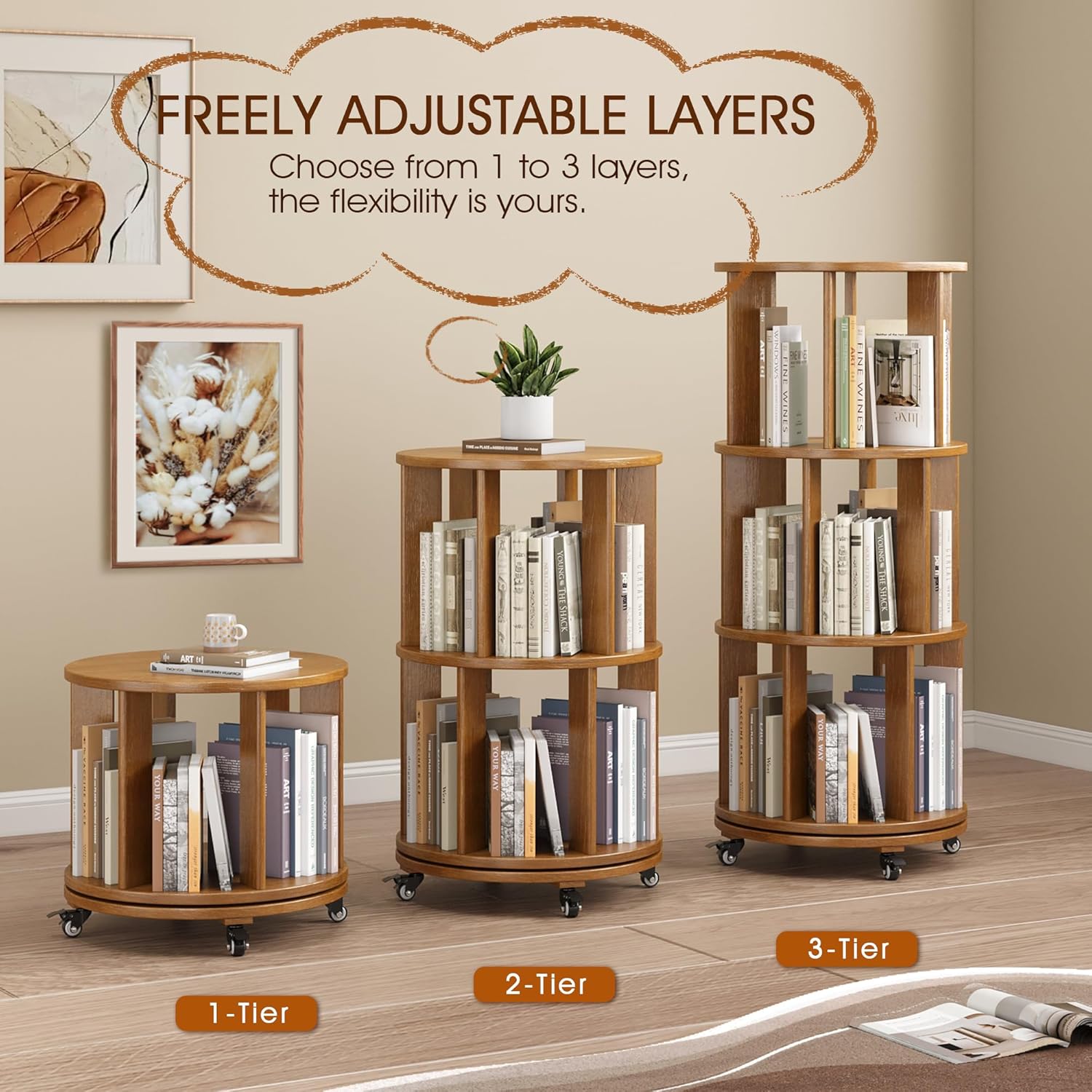 - 360° Safe Rotating Bookshelf: Our swivel bookshelf makes grabbing your favorite reads a breeze. With a gentle spin, your beloved books are right at your fingertips. What's more, keeping your family safe,it comes with lockable caster wheels, ensuring it stands firm even if your playful kids or energetic pets bump into it. With no worries, the easy-roll wheels allow you to effortlessly move the bookshelf to any room, like the bedroom, living room, playroom, or study room
