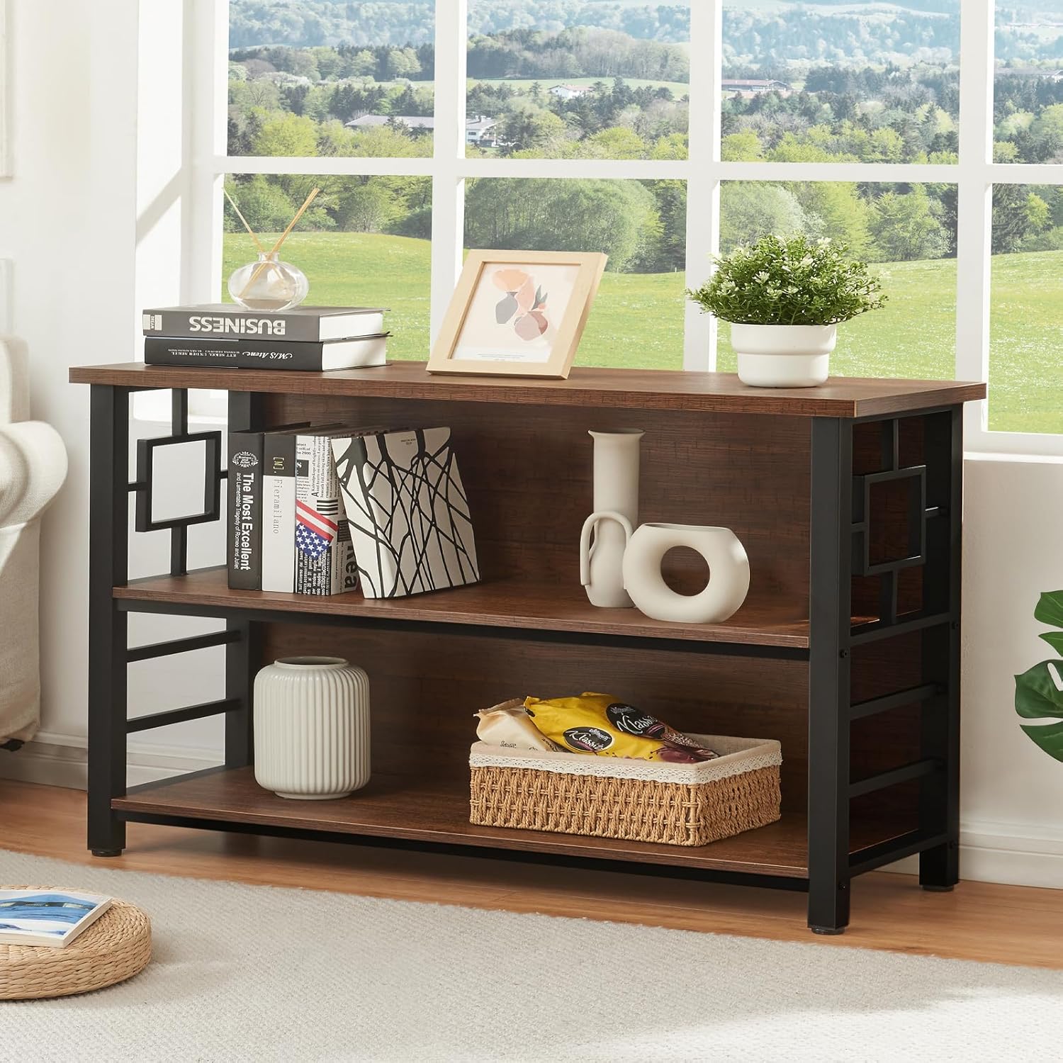 - Generous Storage Space: Featuring three spacious shelves, this rustic bookshelf offers ample room for books, plants, decor, and more, making it perfect for those who want to maximize their storage without compromising on style; Size: 47.2"W x 12.6"D x 30.9"H; The low bookcase is specially designed for small spaces, making it an excellent option for apartments or cozy homes