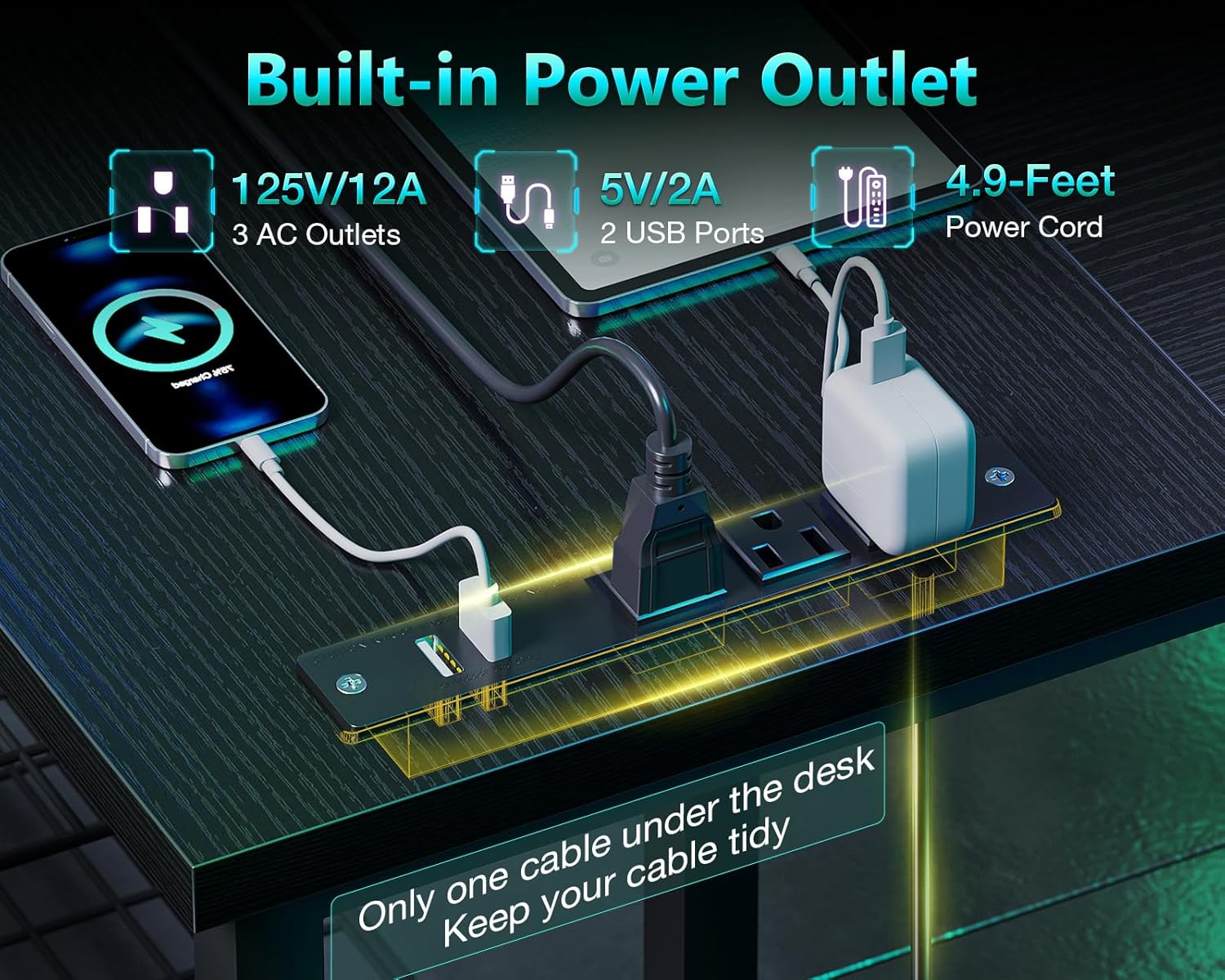 - ăBuilt-in Power OutletsăThis gaming desk features 1 built-in power hubs with 3 AC outlets + 2 USB portsâeffortlessly charge all your devices while keeping cables tidy and within reach.