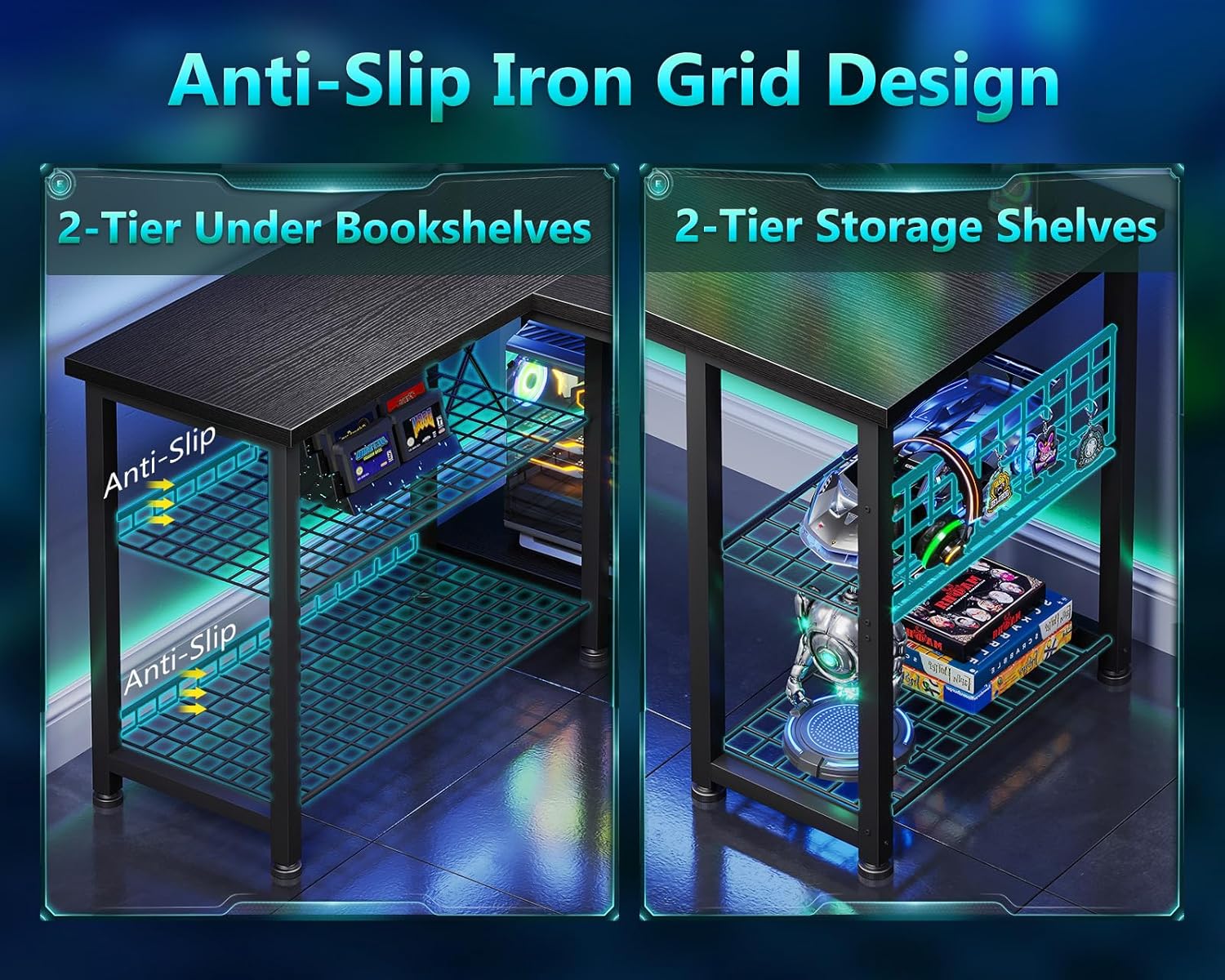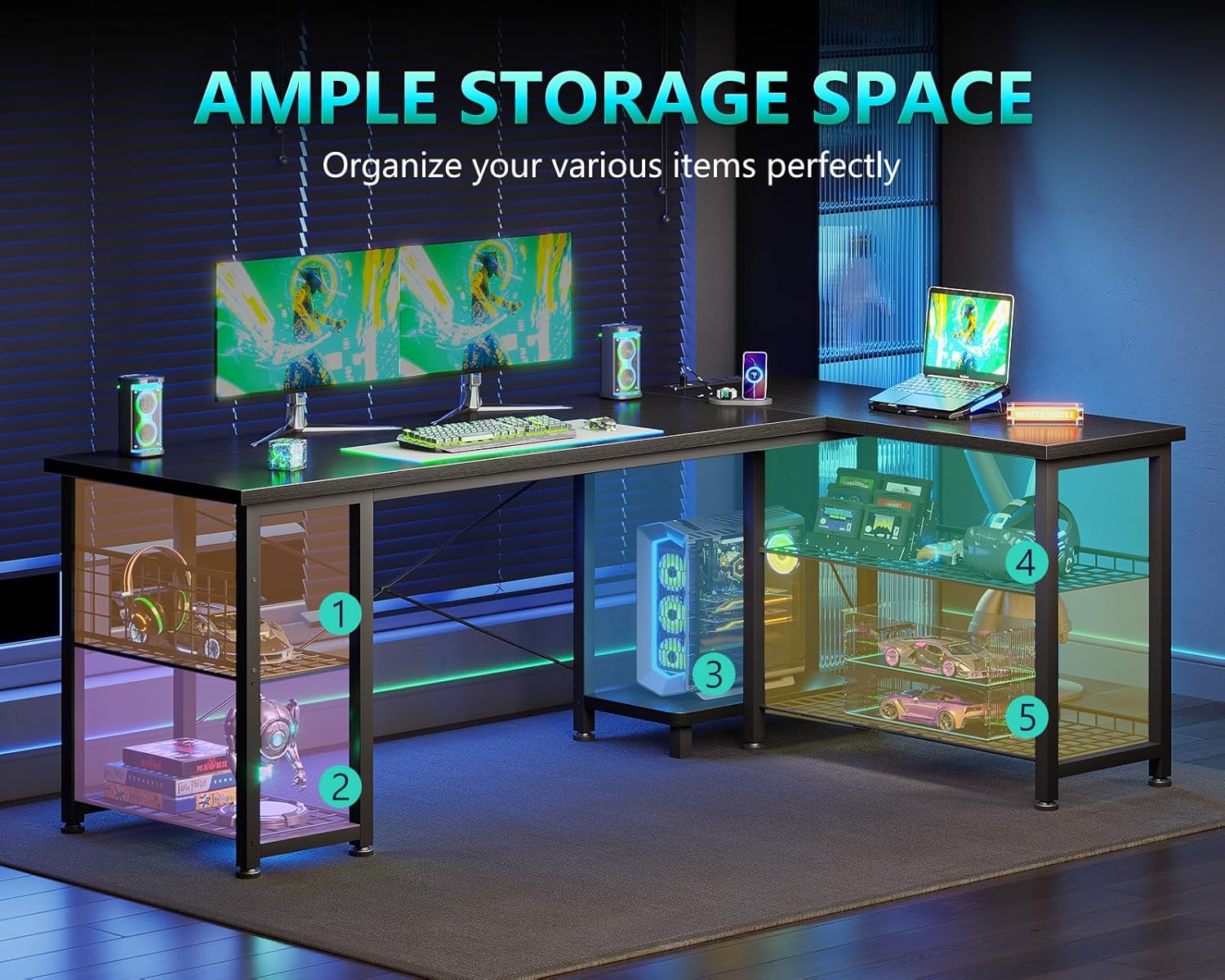 - ăAmple Storage SpaceăCasaottima L-shaped desk provides 4-tier open metal grid shelves and 1 CPU stand. Store frequently used items and decor on the open shelves.Store frequently used items and decorations. It not only makes the items easy to access but also keeps the desktop tidy.