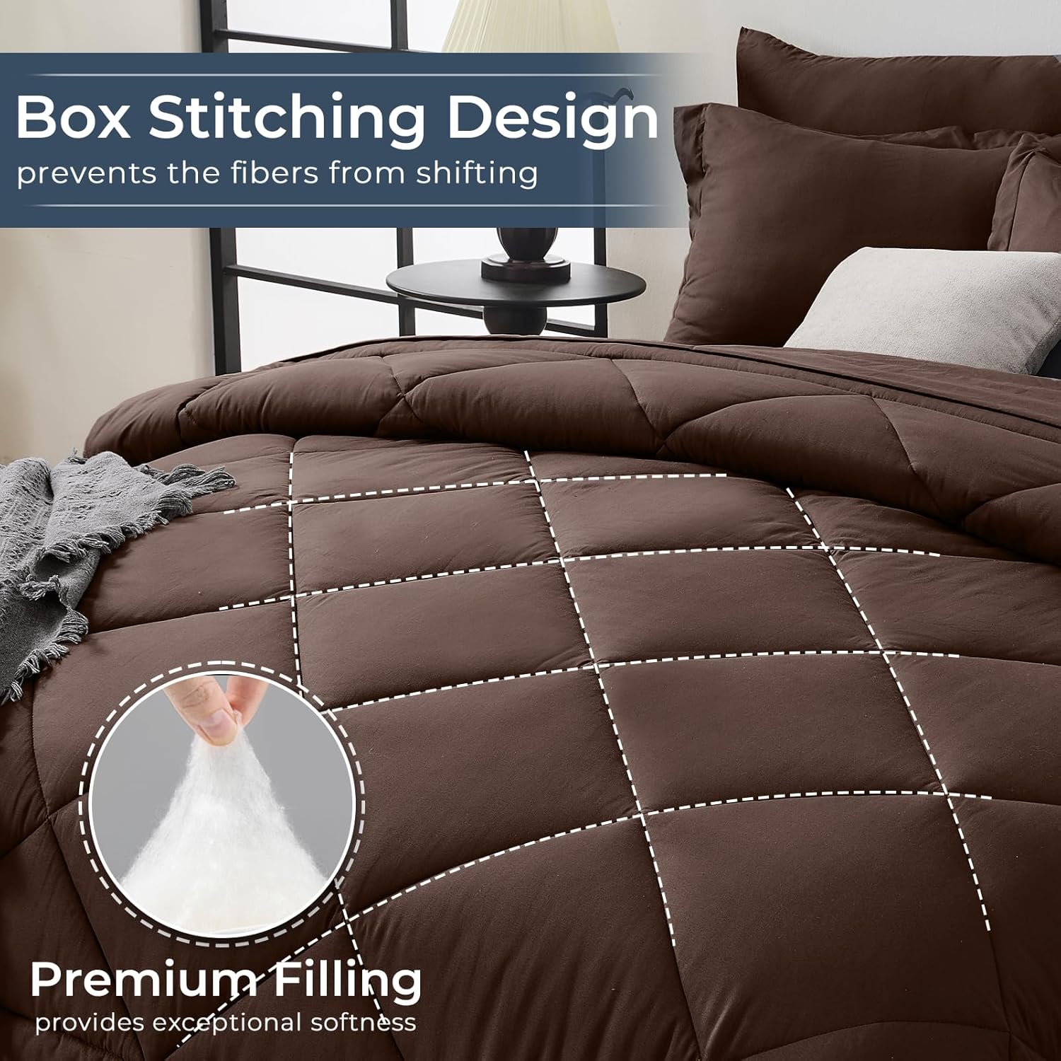 - Practical Details: The 360° elastic fitted sheet with a deep pocket fits most mattresses about 10"-14" deep. The baffle box construction of the comforter prevents the fiber fill from shifting, even after several times of wash