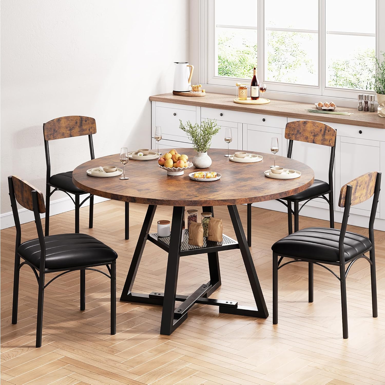 - EXTRA LARGE STORAGE SPACE: A Thoughtfully designed storage shelf is for organizing tableware and kitchen essentials, keeping them easily within reach. It helps maintain a clean, tabletop while providing convenient access to everything you need. Round dining table maximizes the usable area of the dining table, a 47-inch round dining table set for 4, ideal for family meals and gatherings.