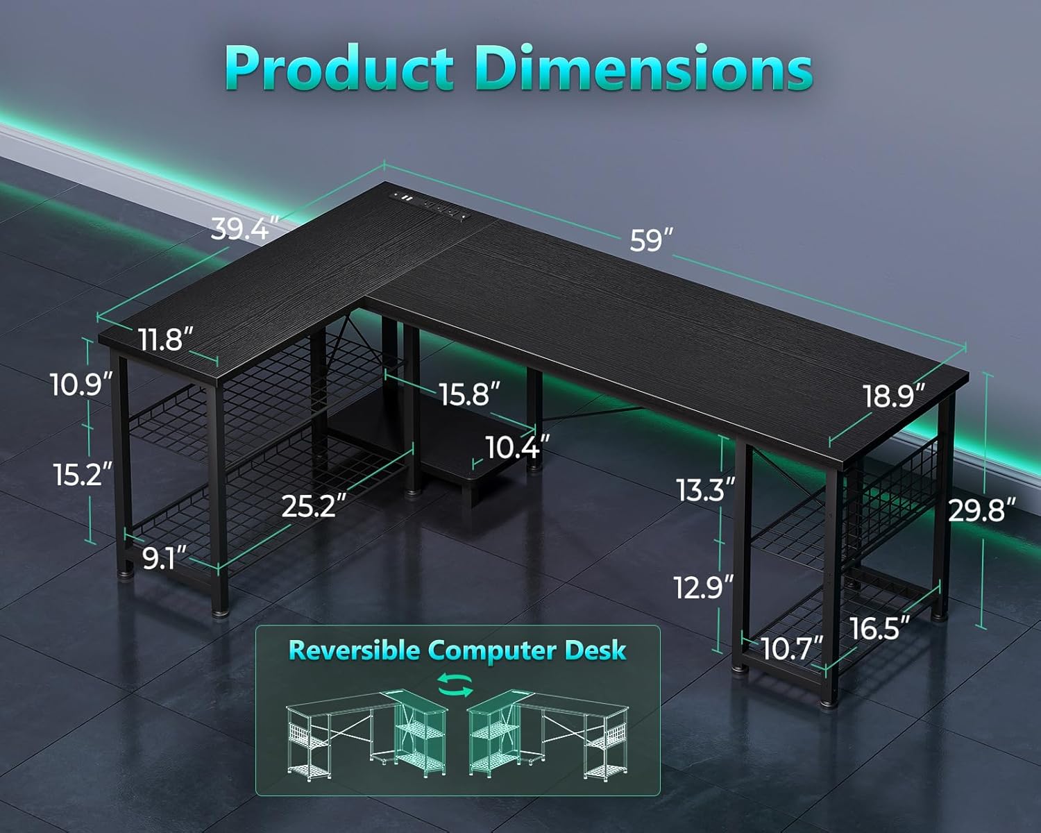 - ăSpacious Desktop Workspaceă With main desk size 59âW x 15.80âD x 29.8âH. This corner desk keeps items organized and maximizes usable area with a clutter-free surface. Reversible left or right layout to fit any room corner effortlessly.This classic color computer desk is suitable for various scenarios such as gaming, office, home, and studio.