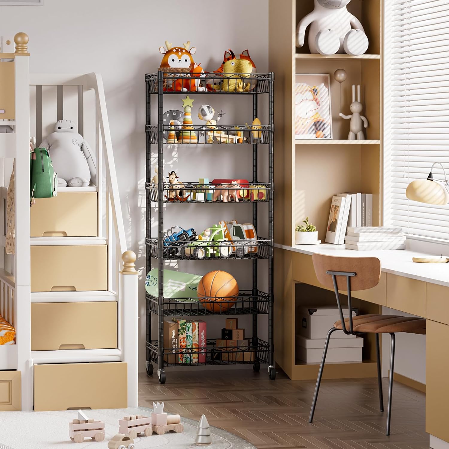 - Features: This shelf is designed with metal mesh baskets to prevent items from falling, each layer height is adjustable to accommodate items of different sizes, and it with wheels for easy mobility.