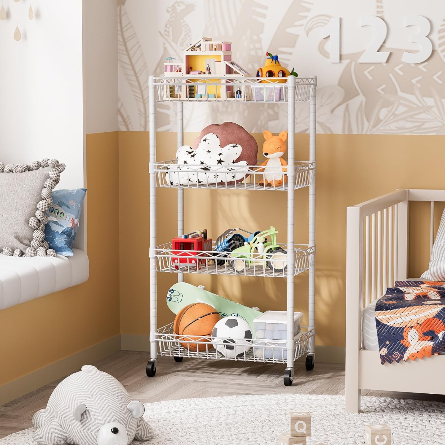 - Features: This shelf is designed with metal mesh baskets to prevent items from falling, each layer height is adjustable to accommodate items of different sizes, and it with wheels for easy mobility.