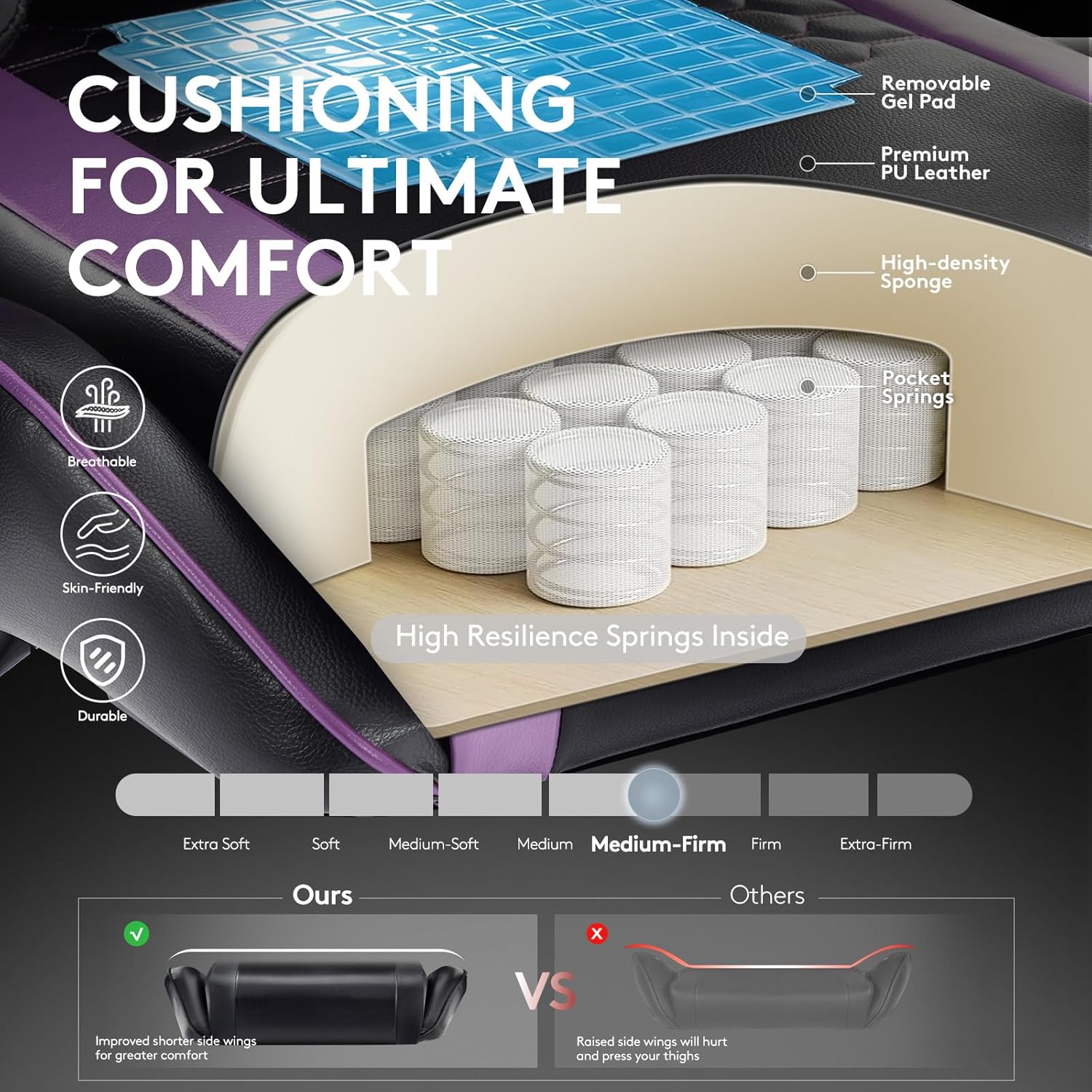 - Ultimate Comfort & Ergonomic Support: Experience sofa-like comfort with a thick seat cushion featuring high-density foam and elastic pocket springs that evenly distribute body pressure. The shorter side wings accommodate a wider range of body shapes while ensuring thigh comfort. The contoured backrest supports the natural curve of your spine, while the adjustable massage lumbar pillow and headrest help relieve back and neck strain. Breathable materials keep you cool and comfortable even during long sessions.