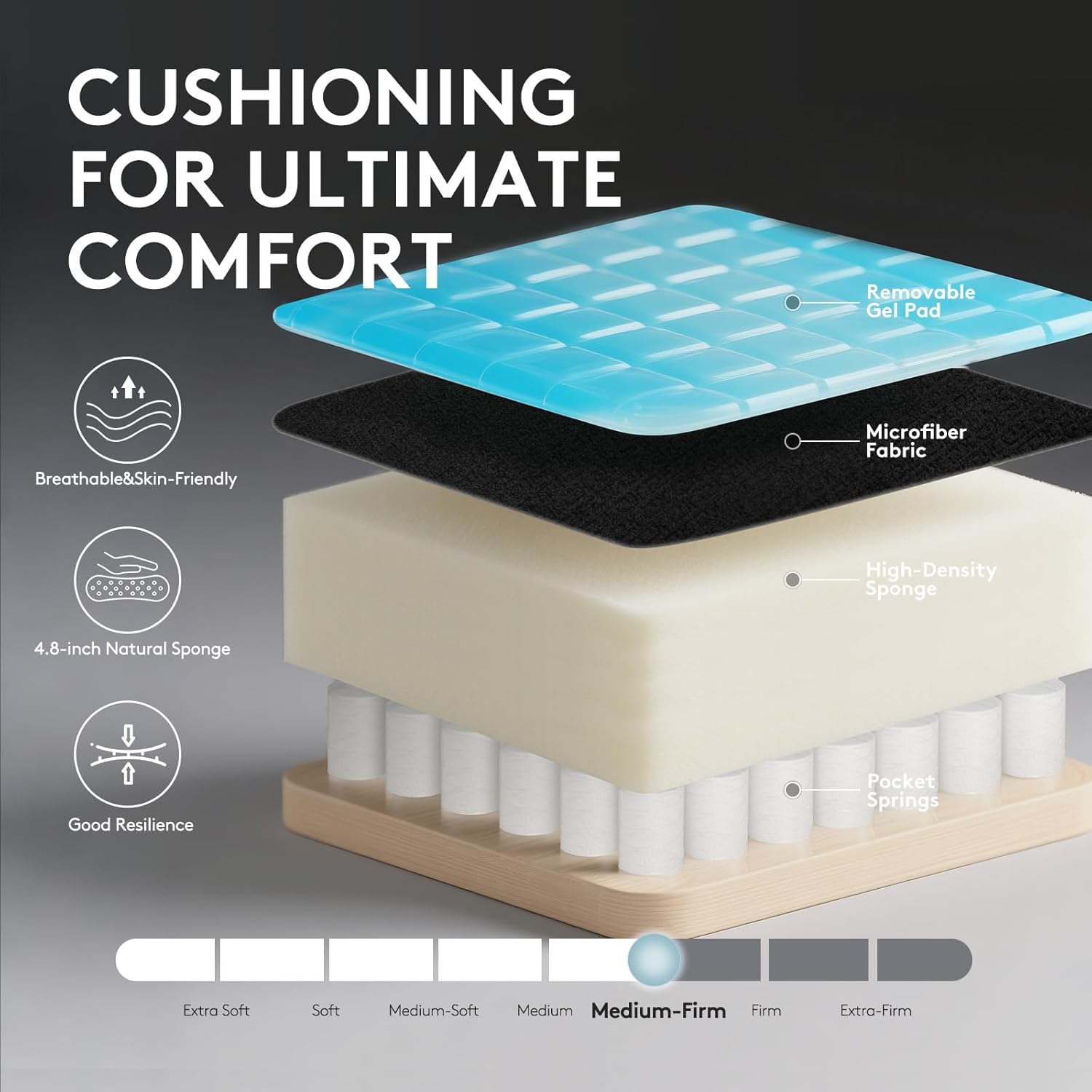 - Cooling Comfort Spring Cushion: The seat cushion of this chair is composed of ultra-thick high-density foam and pocket springs, providing sofa-like elasticity and comfort. The springs help distribute pressure evenly, allowing you to sit for long periods without fatigue. An additional detachable gel pad can be placed on the lumbar pillow or seat surface to improve breathability and reduce heat buildup.