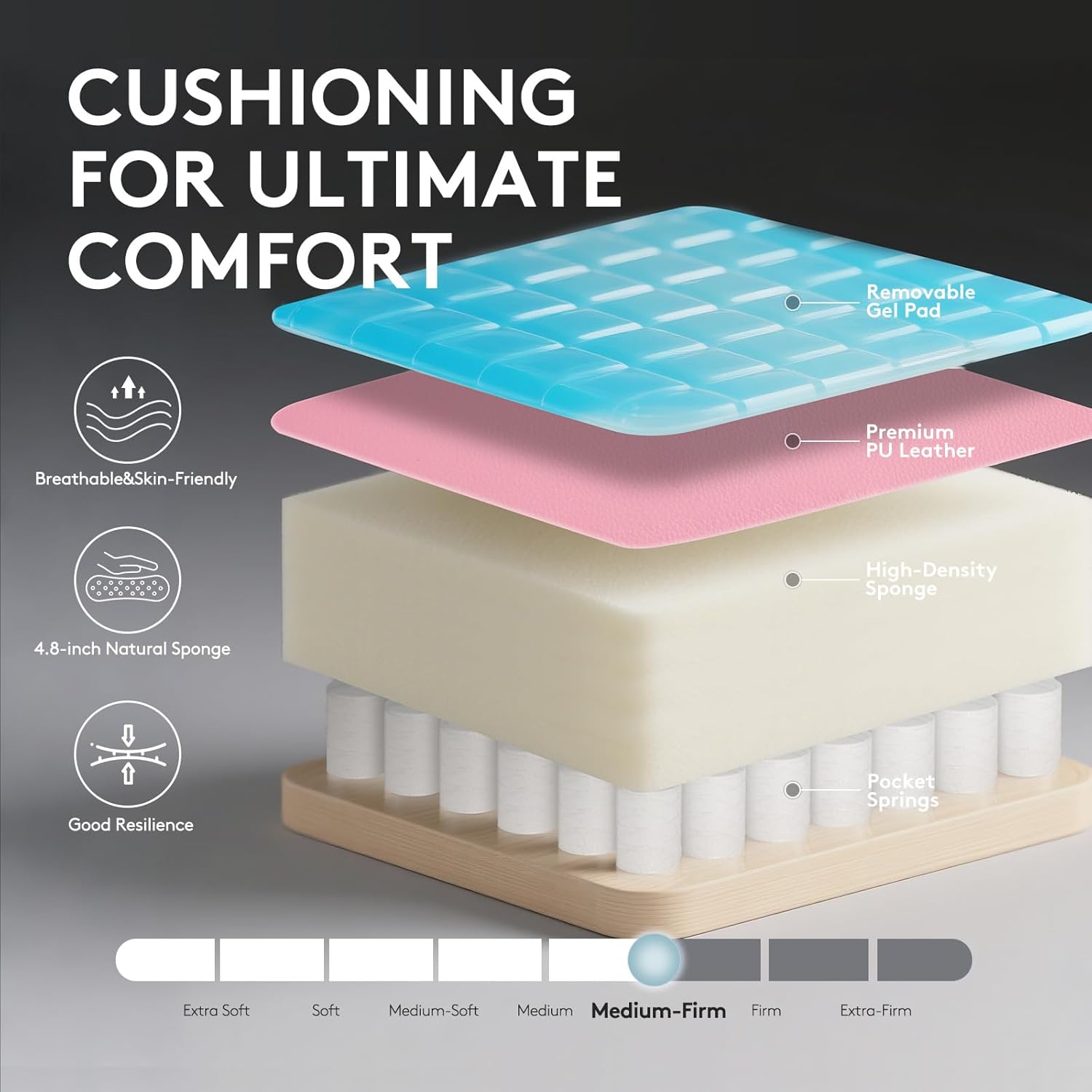 - Cooling Comfort Spring Cushion: The seat cushion of this chair is composed of ultra-thick high-density foam and pocket springs, providing sofa-like elasticity and comfort. The springs help distribute pressure evenly, allowing you to sit for long periods without fatigue. An additional detachable gel pad can be placed on the lumbar pillow or seat surface to improve breathability and reduce heat buildup.