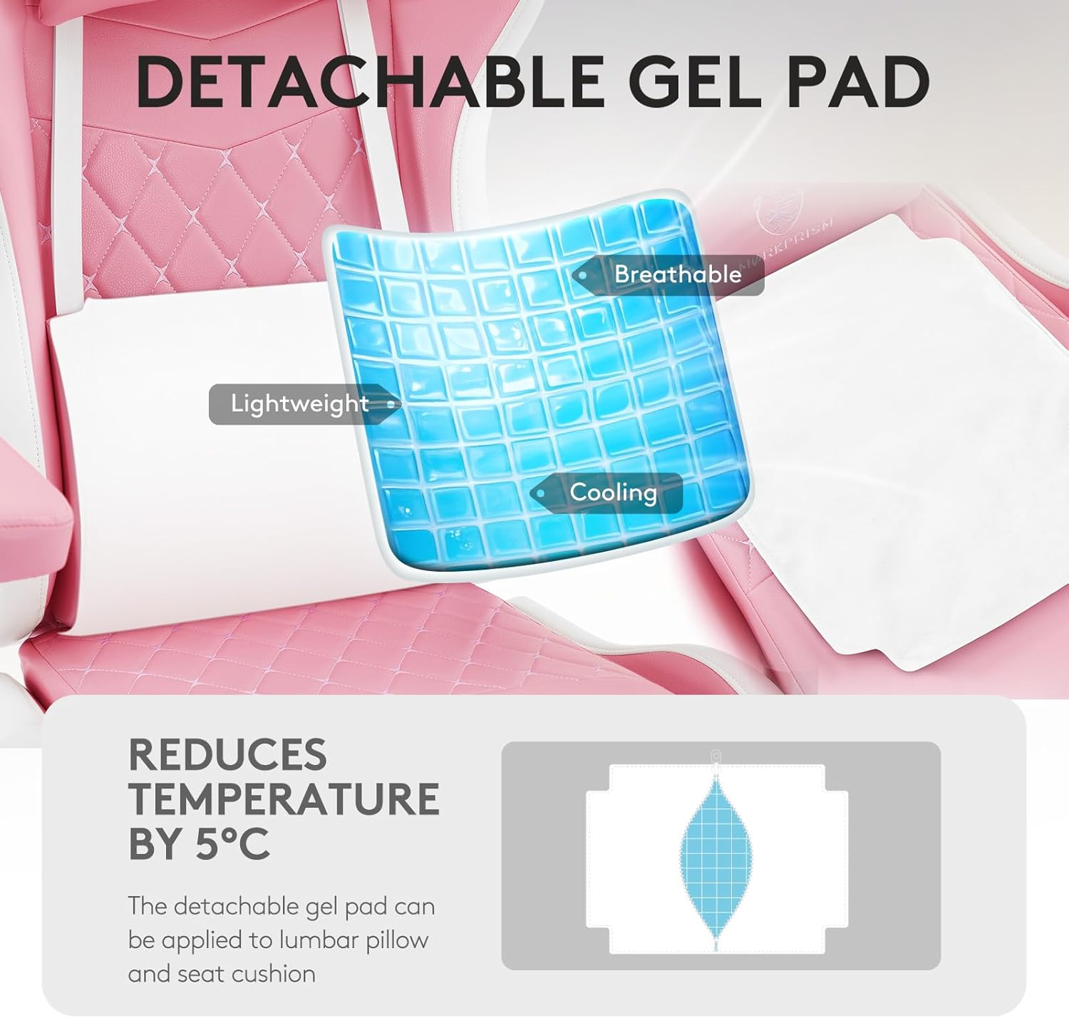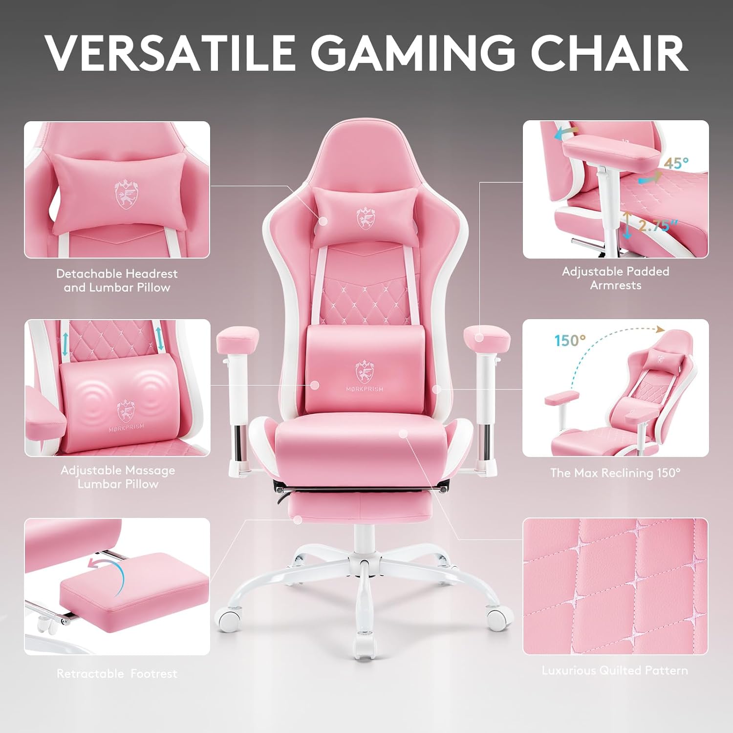 Gaming Chair,Computer Office Chair with Footrest,Massage Lumbar Support and Gel Pad,Ergonomic Reclining Leather Gamer Chair with Headrest,Adjustable Armrests and Spring Cushion Pink