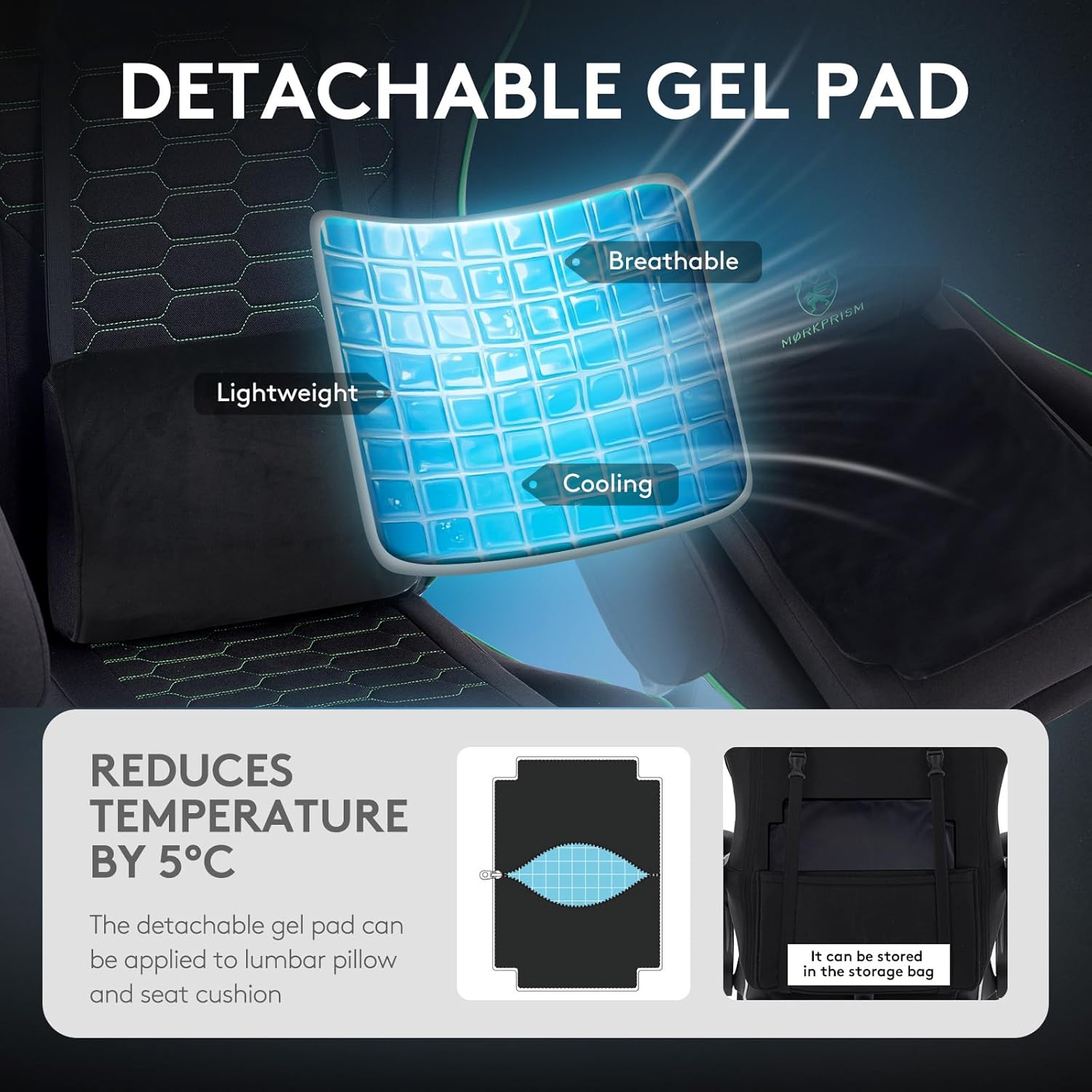 - Cooling Gel Pad: Includes a detachable gel pad that can be attached to the lumbar pillow or seat surface to improve airflow and provide a cooler sitting experience.