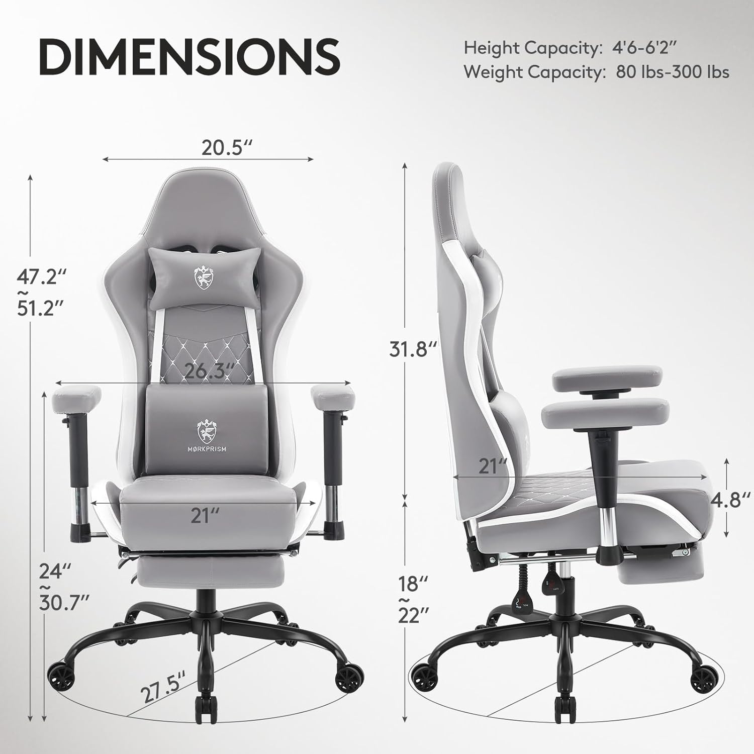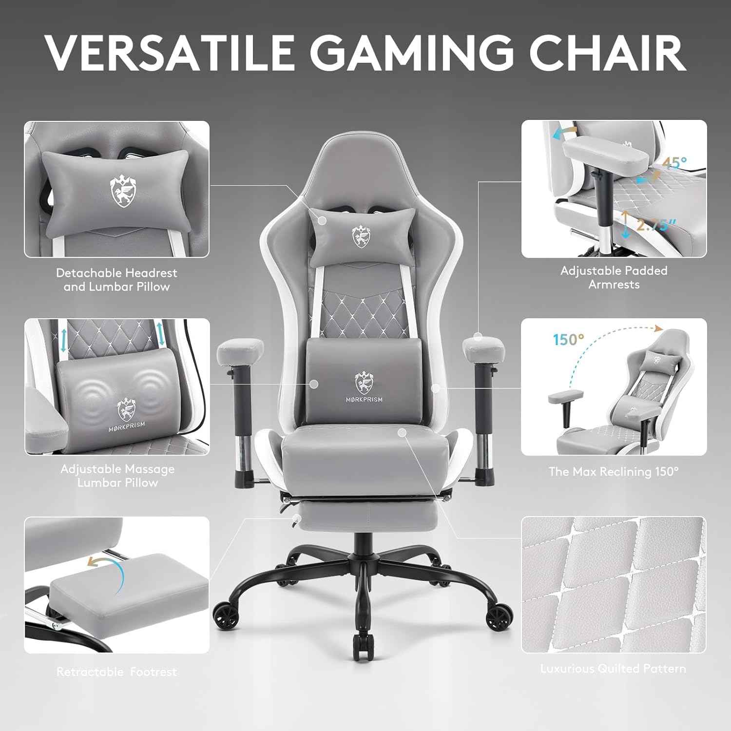 Gaming Chair,Computer Office Chair with Footrest,Massage Lumbar Support and Gel Pad,Ergonomic Reclining Leather Gamer Chair with Headrest,Adjustable Armrests and Spring Cushion Grey White