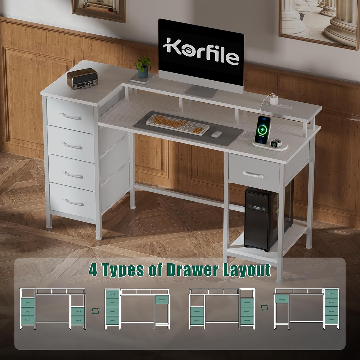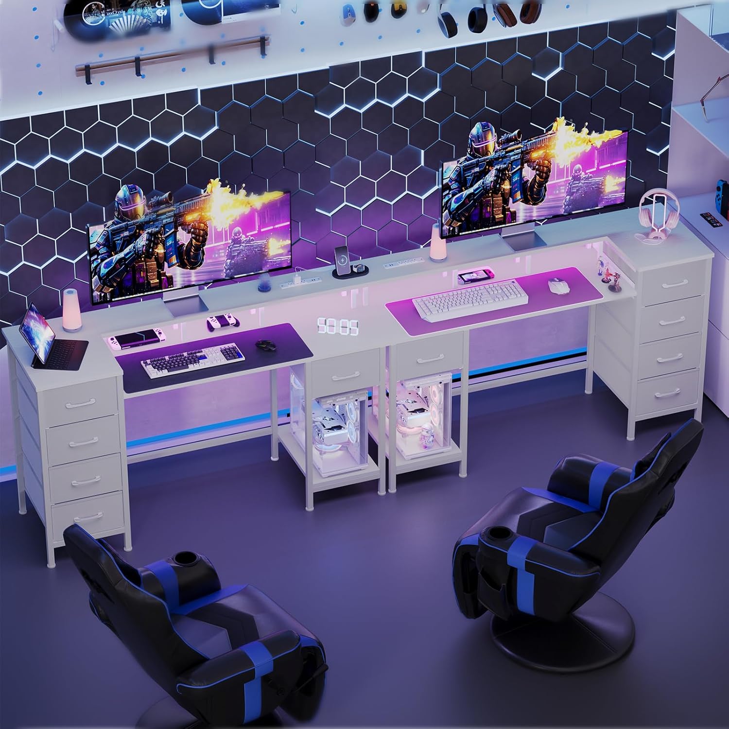 47 Inch Computer Gaming Desk with Power Outlets & LED Lights Reversible Home Office Desk with Adjustable 5 Fabric Storage Drawers for Working Writing Study, White Oak