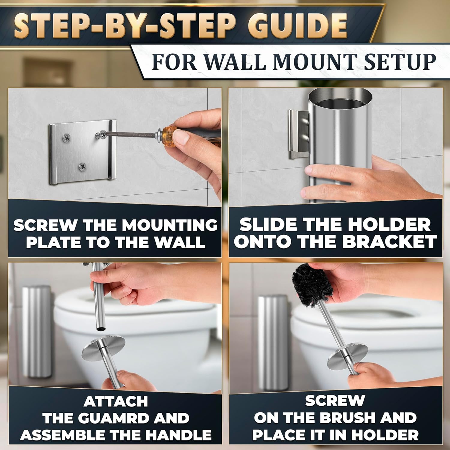 - Wall-Mount Holder: Ergonomic stainless steel toilet brush and holder set keeps your toilet bowl cleaning brush off the floor. Toilet bowl cleaners brush and holder offers discreet storage for small bathrooms