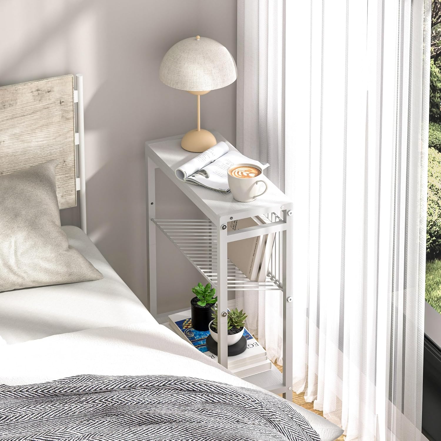 End Table for Small Space, 3-Tier Narrow Side Table with Magazine Holder,Small Nightstand, Skinny Snack Couch Table in Living Room, Bedroom Study and Balcony (White)