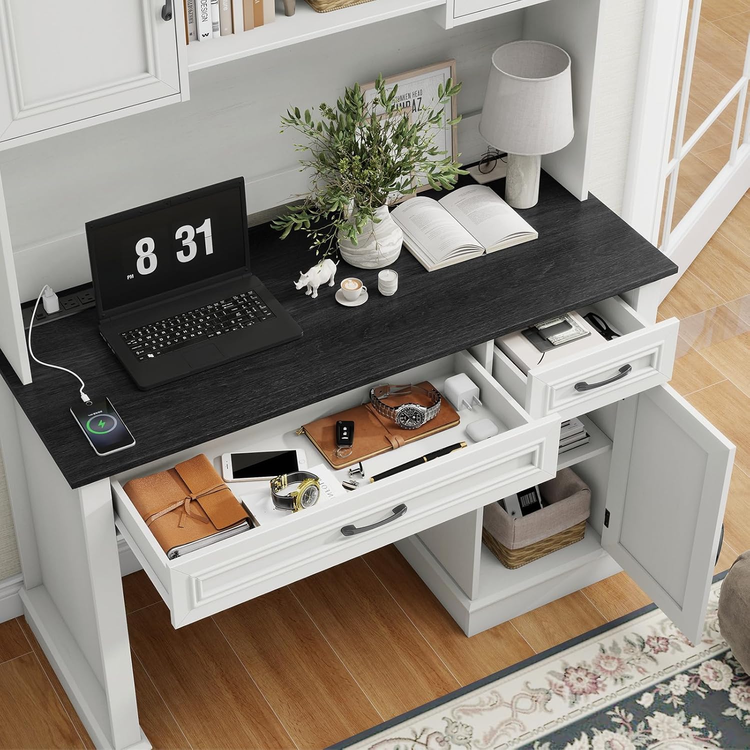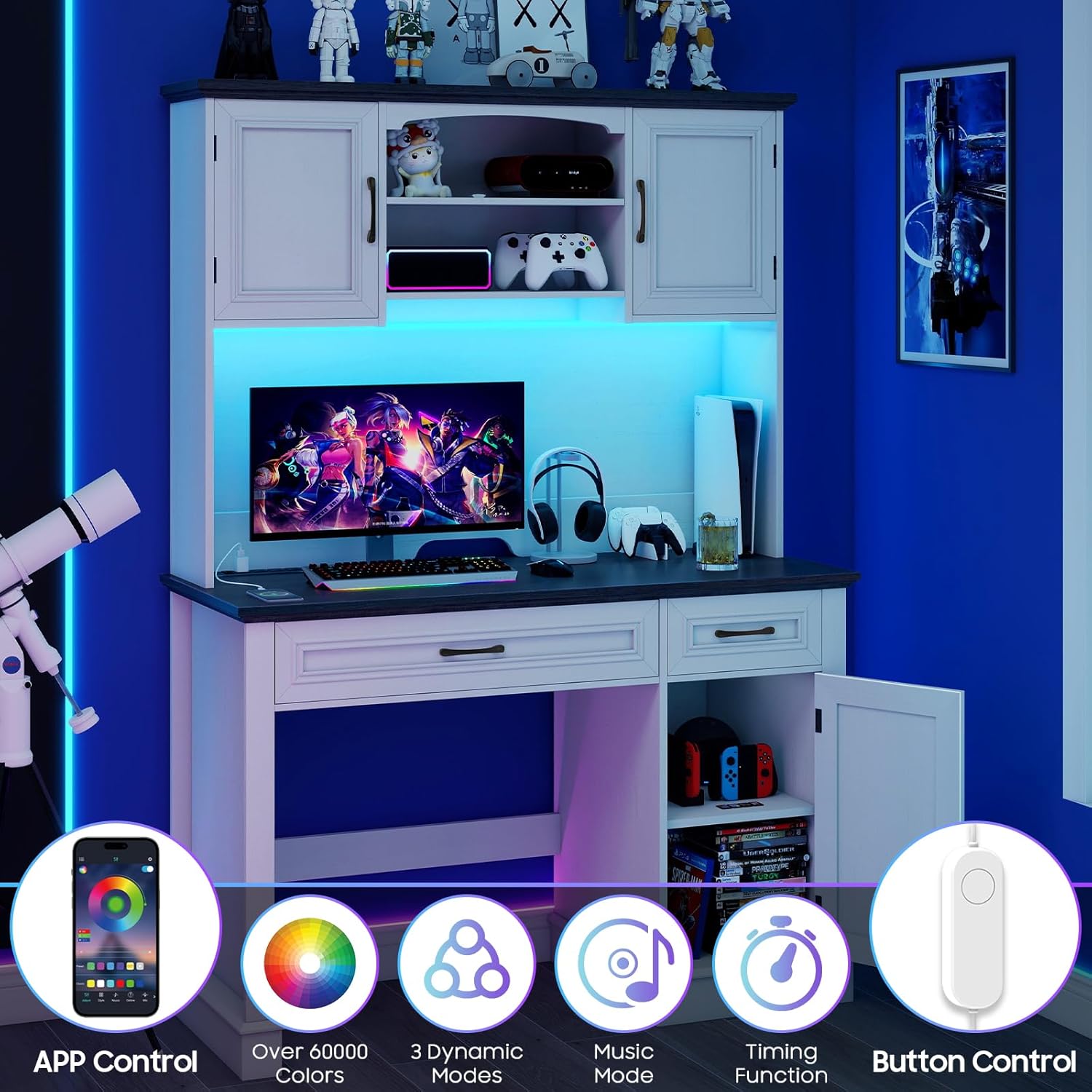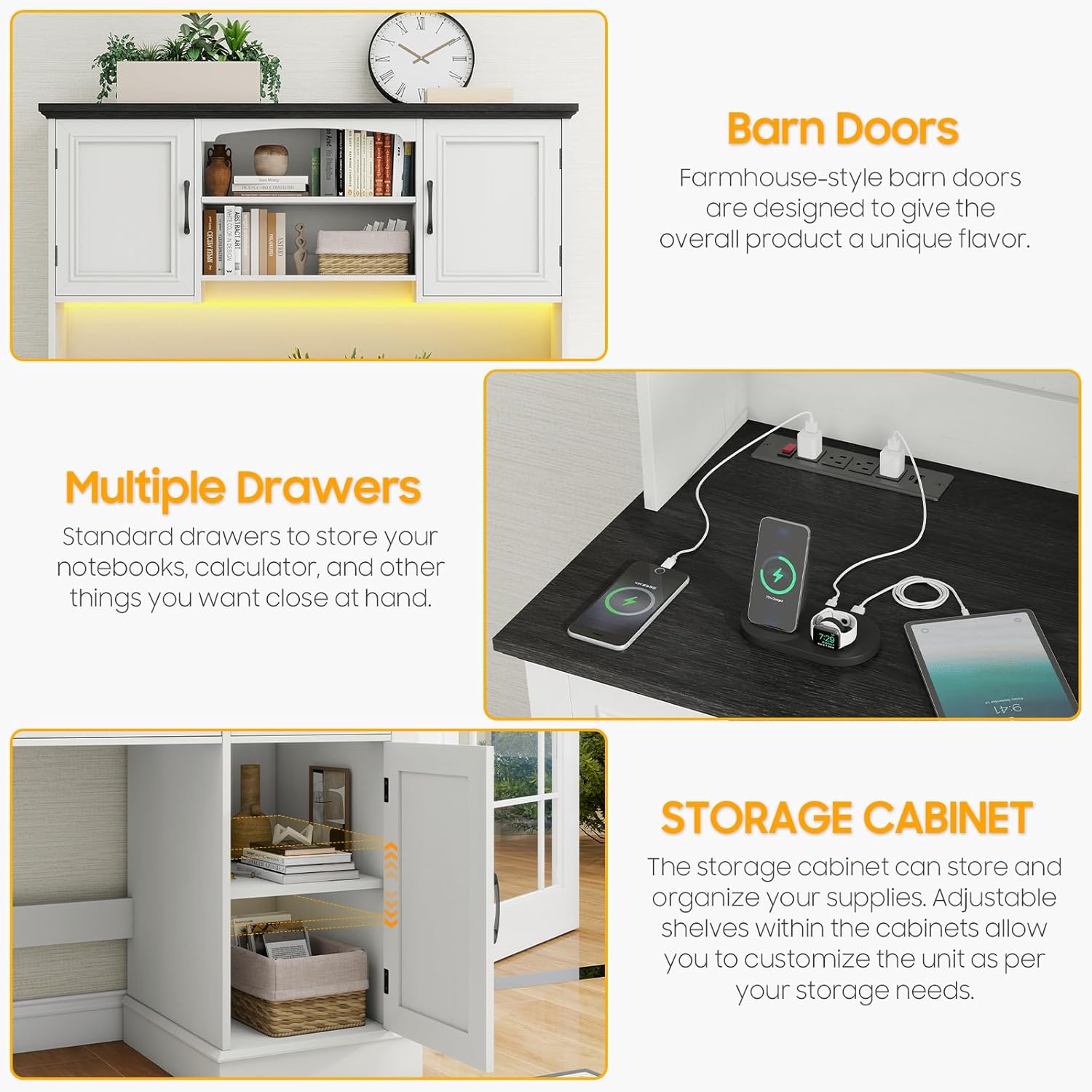 Farmhouse 47" Executive Desk with Hutch, 2 Drawers and LED Light, Computer Desk with Storage Cabinet and Charging Station,Workstation for Home Office and Study.