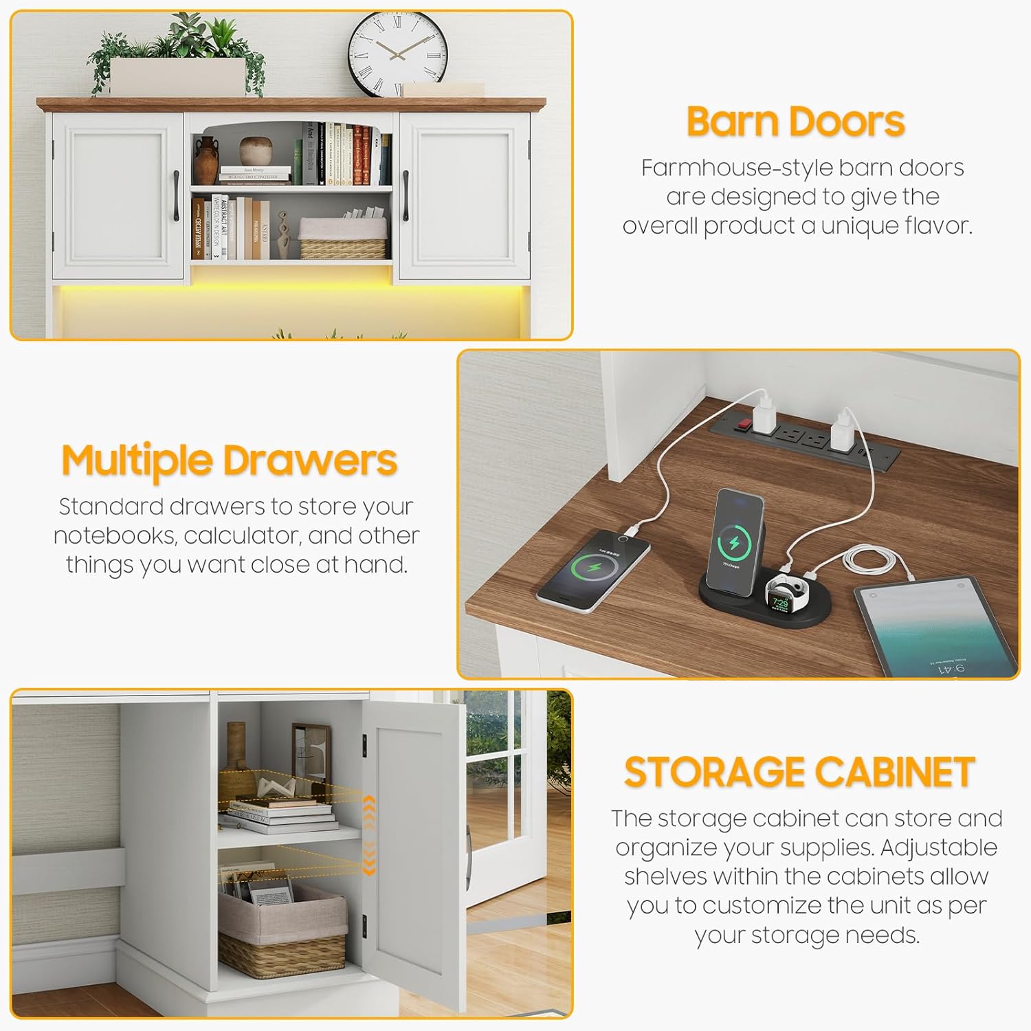 Farmhouse 47" Executive Desk with Hutch, 2 Drawers and LED Light, Computer Desk with Storage Cabinet and Charging Station,Workstation for Home Office and Study.Unique White