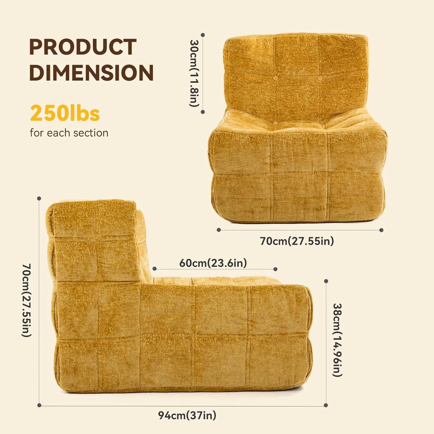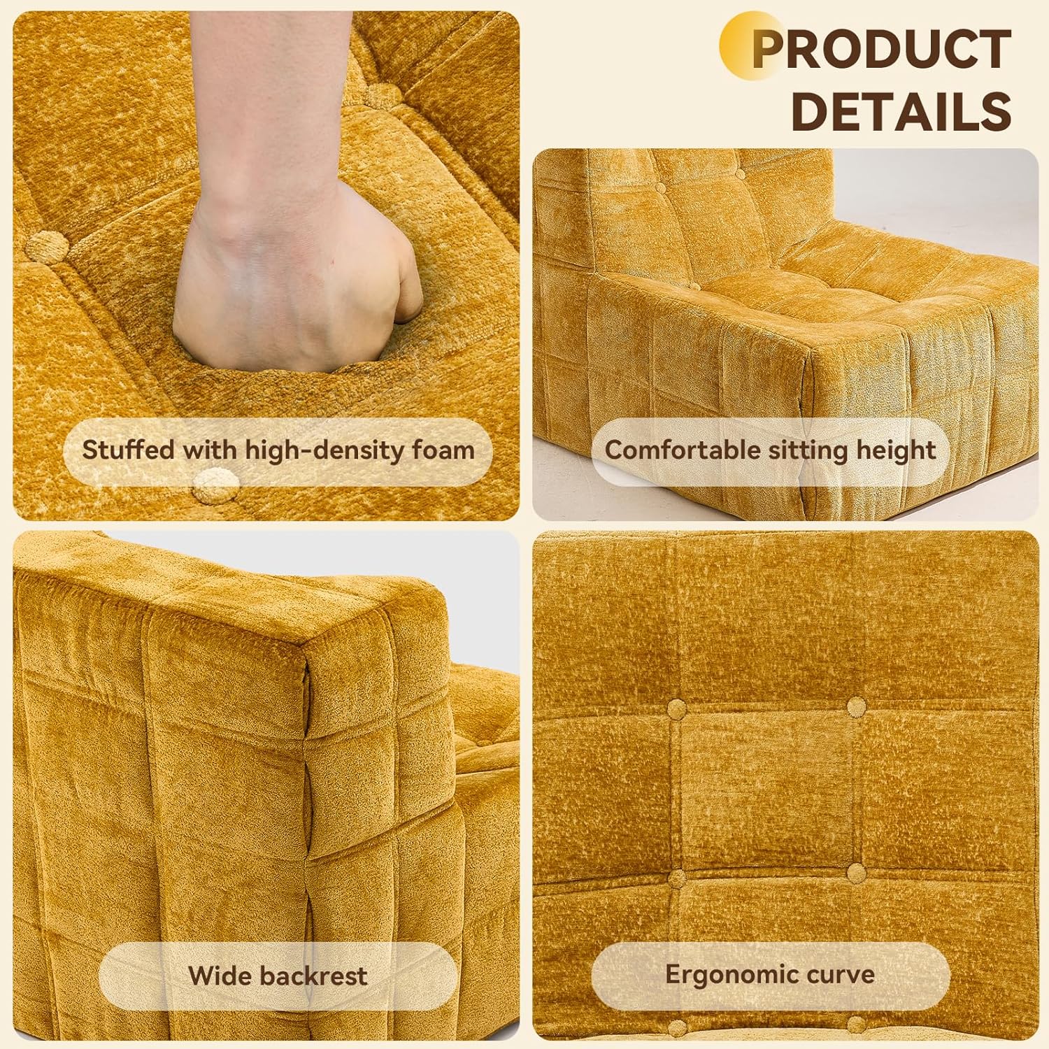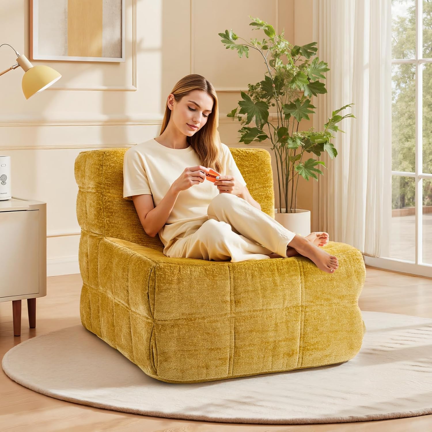 Bean Bag Chair, Soft Chenille Pre-Filled Lazy Chair Floor Sofa Bean Bag Chair for Adults and Teens, Accent Chair for Living Room Bedroom Apartment (Yellow)