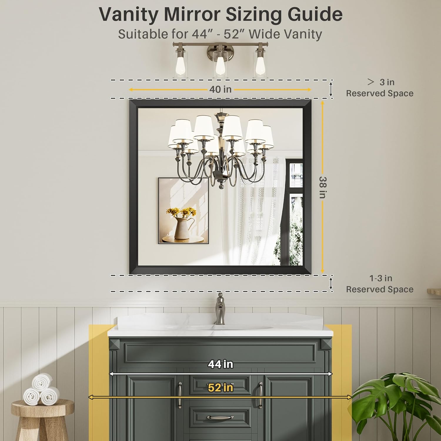 40x38 Inch Black Bathroom Mirror for Wall, Thick Metal Framed Rectangle Mirrors for Over Sink, Bedroom, Living Room, Entryway, Anti-Rust, HD Tempered Glass