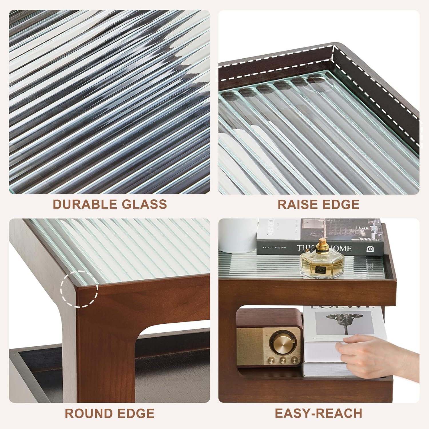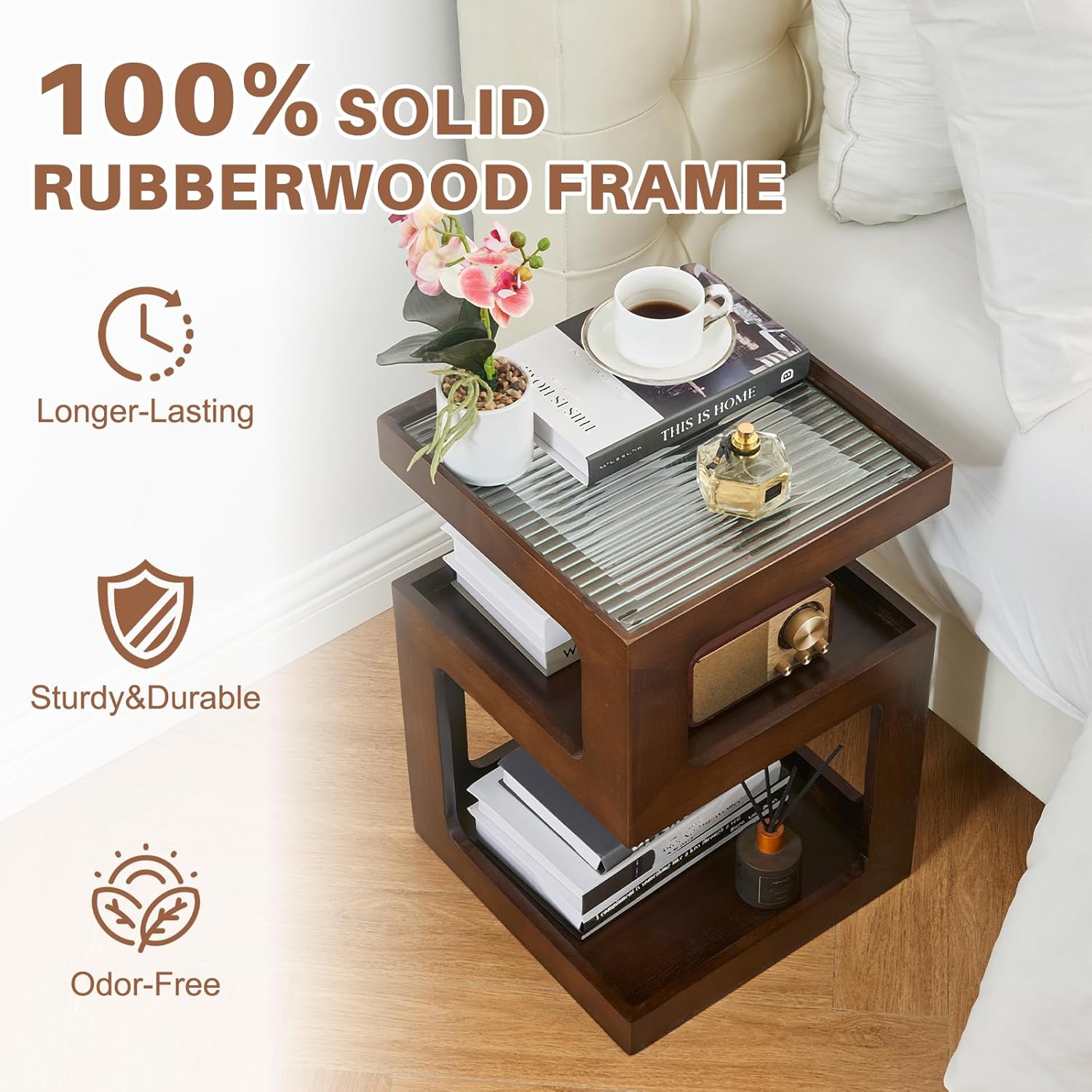 - 【Durable Tempered Glass Top】The tabletop of the walnut side table is made of high-quality and high-definition tempered glass, which has a hazy beauty and is not afraid of spilling tea cups. The wooden nightstand can be easily cleaned with a light wipe and does not require insulation pads. Hot drinks can be placed directly on the end table.