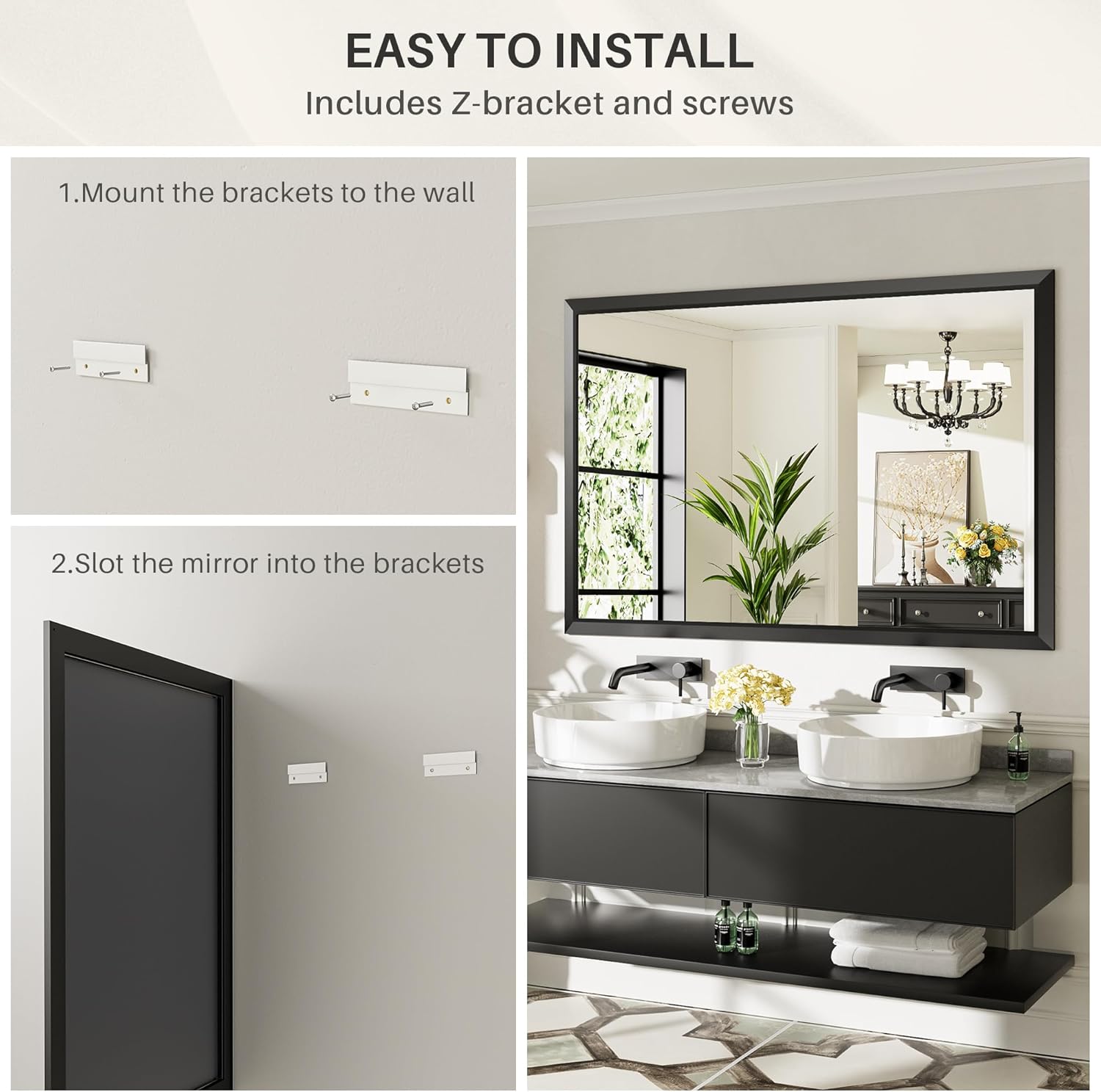 - ššš¬š² ššØ šš§š¬ššš„š„: The modernized mirror comes with two Z-bar wall brackets, it's easy to install the mirror and you can choose to hang the mirror vertically or horizontally depending on the specifications of your bathroom. The bracket is sturdy enough to support the weight of the mirror.