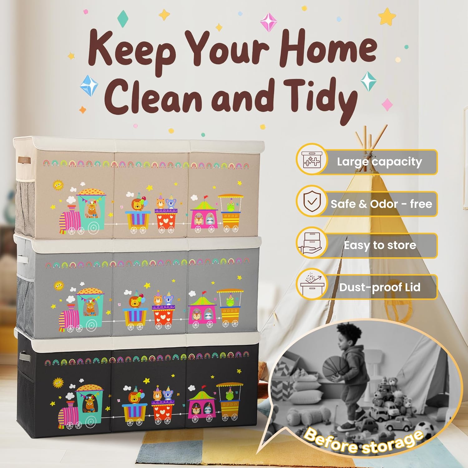 - Foldable & Dust-proof: This toy bin for kids features a Velcro flip-top design, which can be freely disassembled to effectively block dust. It is equipped with a removable partition board inside, making it convenient to classify and store toys. When not in use, it can be folded for storage, making it easy to store and carry.