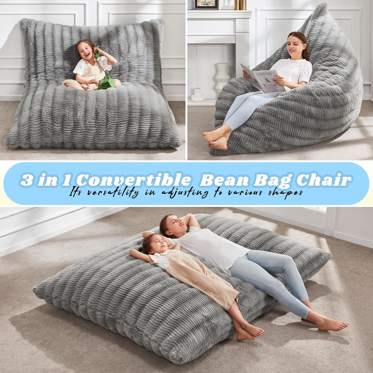 Hobestluk 3 in 1 Bean Bag Chair Giant Bean Bag Chairs for Adults with Ripple Cover Convertible Bean Bag Floor Cushion with Machine Washable Cover for Living Room (Ripple Grey)