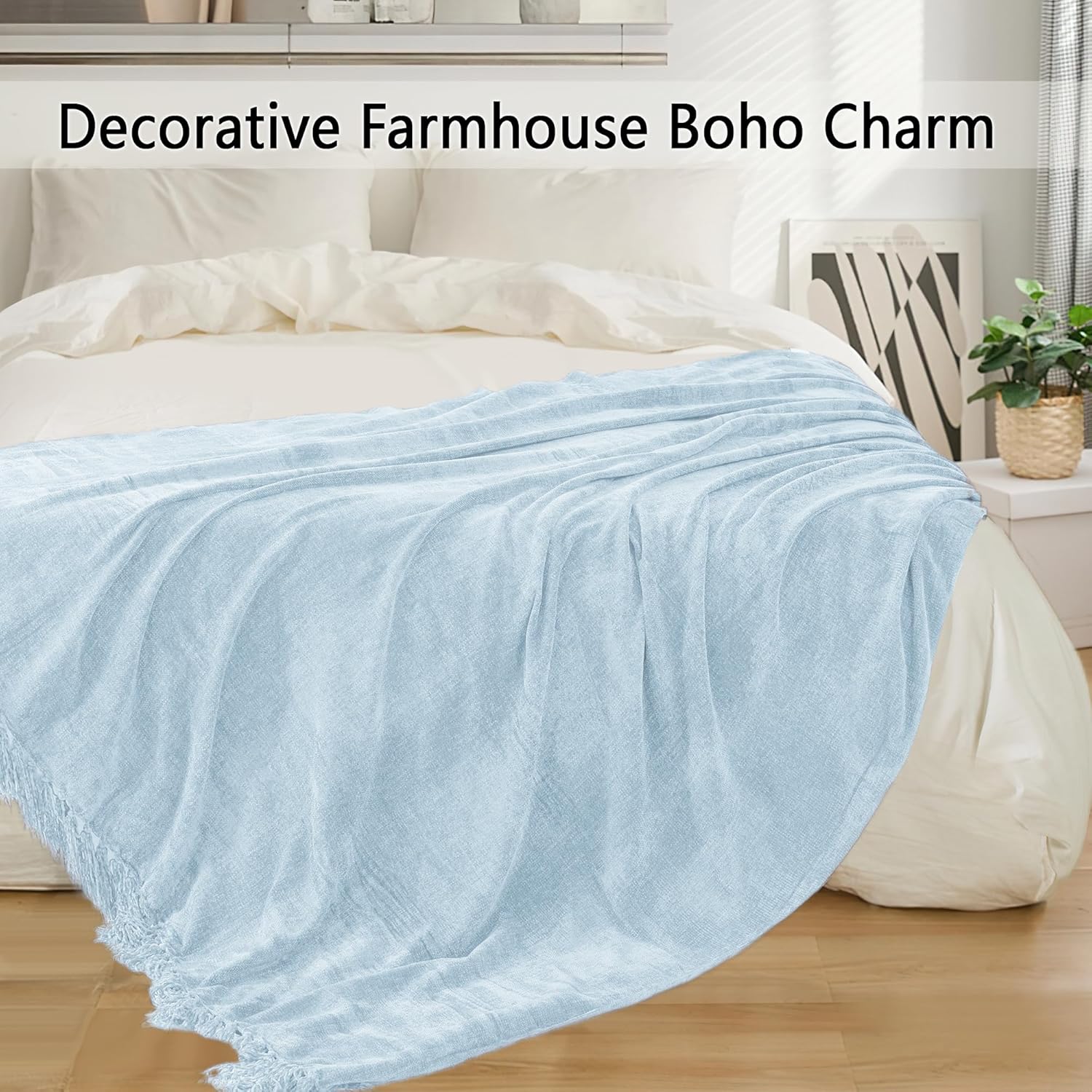 Chenille Throw Blanket for Couch 50"X 60", Soft Cozy Throws with Fringe Tassel for Bed Sofa Chair Cover, Lightweight Knitted Decorative Boho Blankets for Living Room, Light Blue