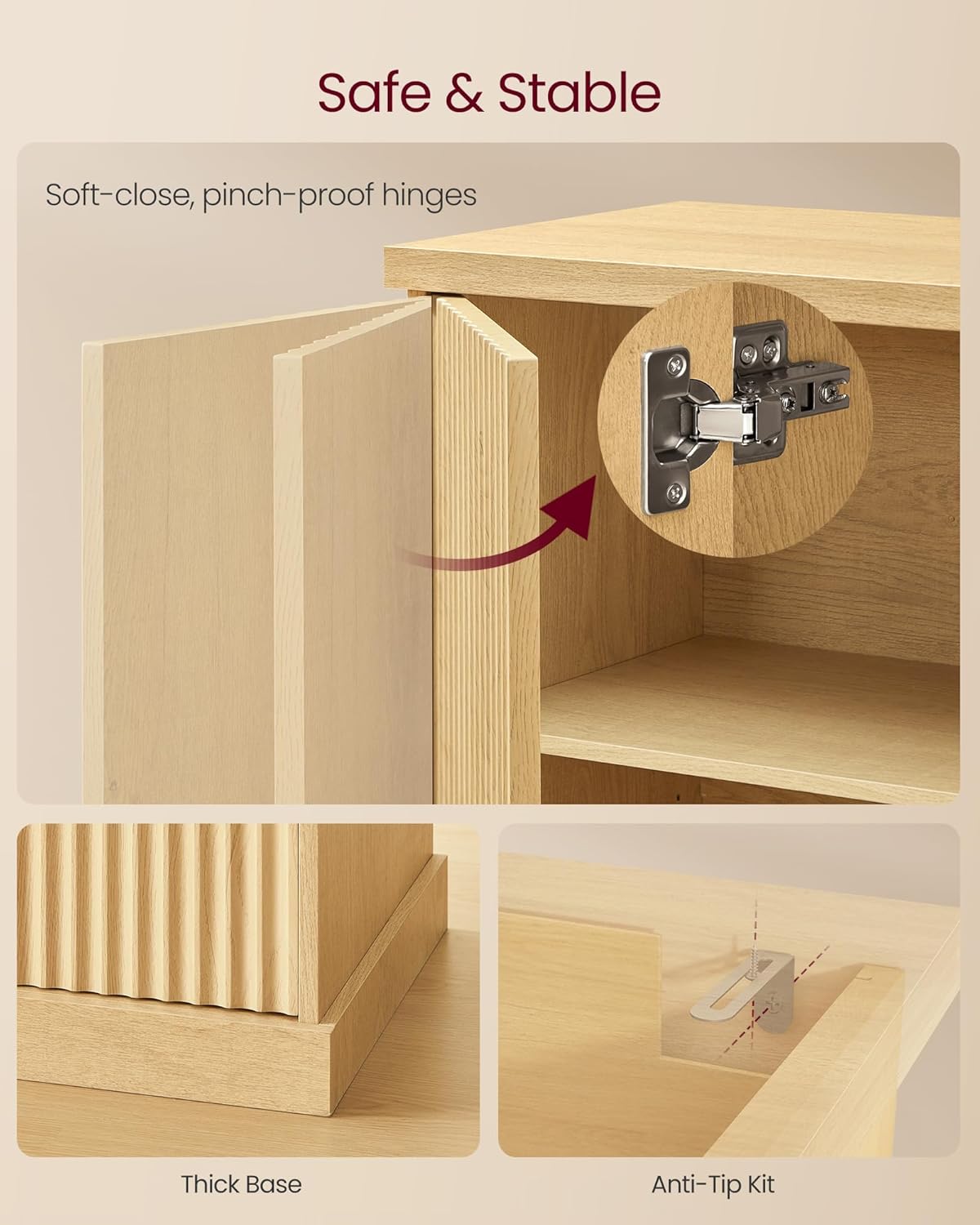 - Enhanced Safety: Soft-close hinges prevent slamming and pinched fingers, while anti-tip kit ensures stability. The 15.8"D x 58.3"W x 31.5"H buffet cabinet keeps your home secure