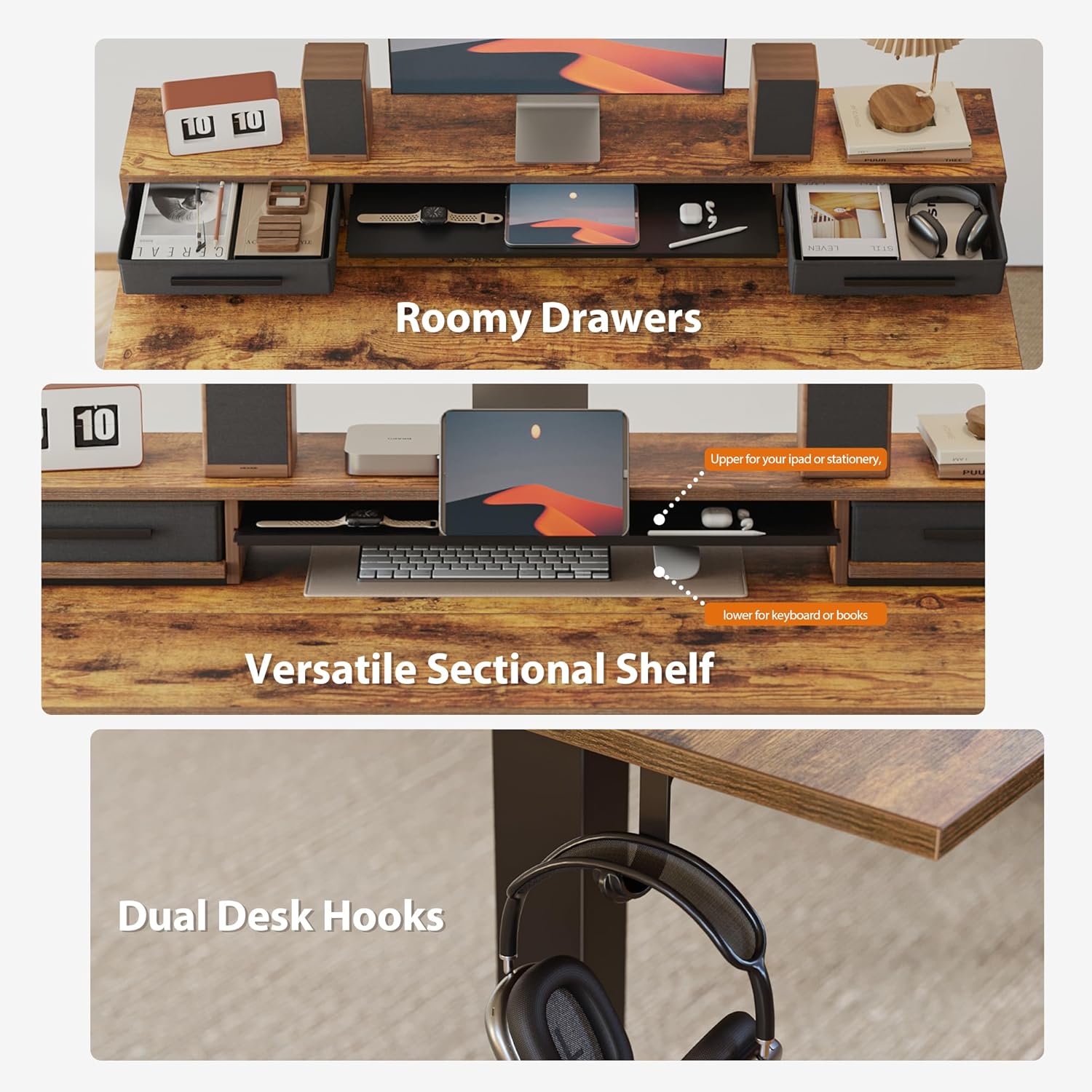 - 【Multi-Storage System】Spacious storage space, combining drawers with dedicated shelving panels for optimized organization.The two fabric drawers offer hidden storage to maintain a clutter-free workspace.The central shelf unit provides dual-level organization: The top tier stores office accessories, the lower level accommodates keyboard/mouse.