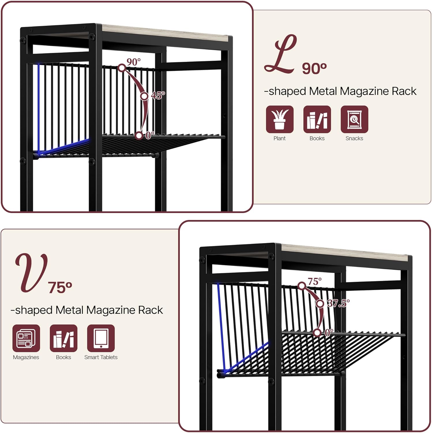 - [Unique LorV-shaped Metal Magazine Rack] Slim side table has Large L or V shaped magazine racks provide extra storage space for organizing reading material or other clutter. The hollow design allows you to see at a glance the magazines and books you have on display and quickly find what you are looking for. It's perfect for organizing books, magazines, laptops, smart tablets, e-readers and more!
