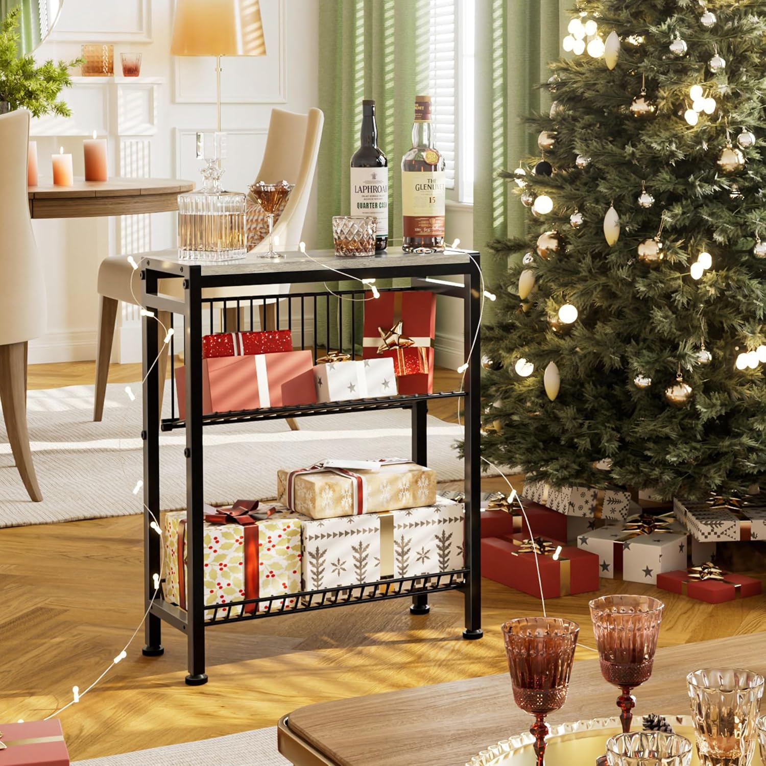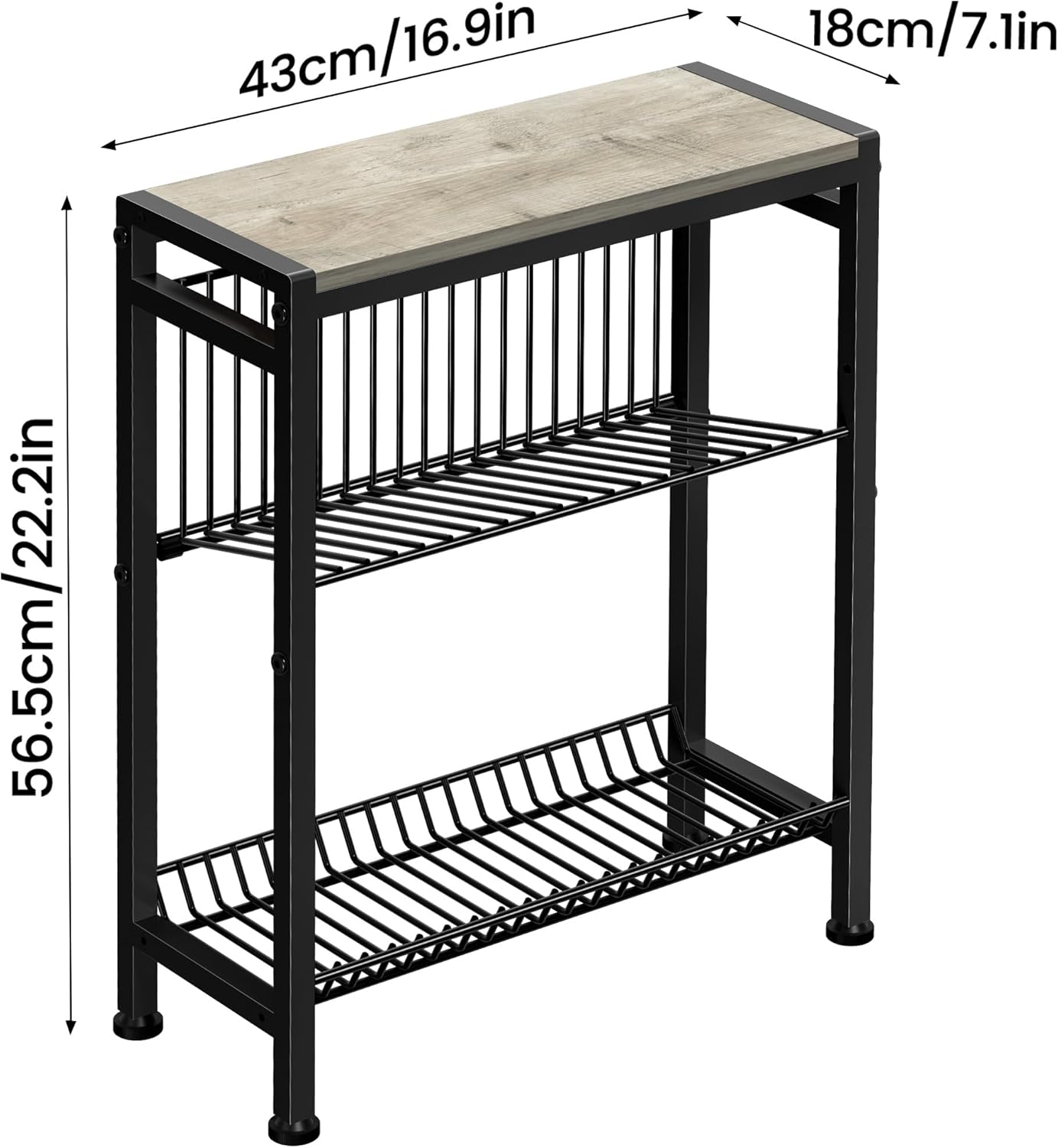 - [Space Saving Designs] Product Size: 7.1"D x 17"W x 22.2"H. Great Designs for Tight Spaces, especially for use as a sofa side table or slim nightstand. This narrow side table takes up a small amount of space, but still has plenty of room for storage. You can put your cell phone, coffee mugs on the top shelves, and books like magazines in the L or V shaped basket in the center,put snacks or toys in the wire shelf in the bottom