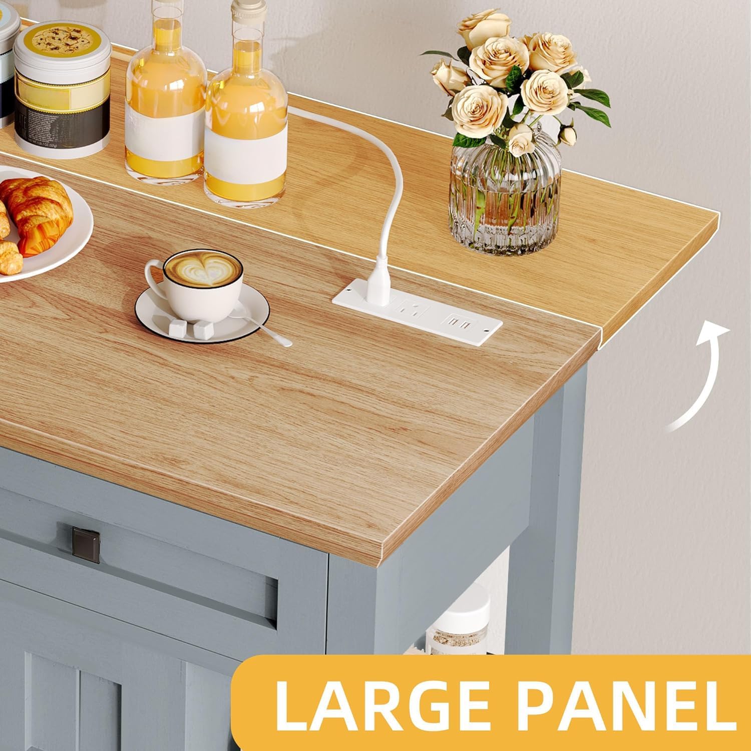 DWVO Rolling Kitchen Island with Drop Leaf, Mobile Storage Islands with Power Outlet Foldable Tabletop, 2 Drawers and Open Shelves, for Living Room, Dining Room, Blue Gray