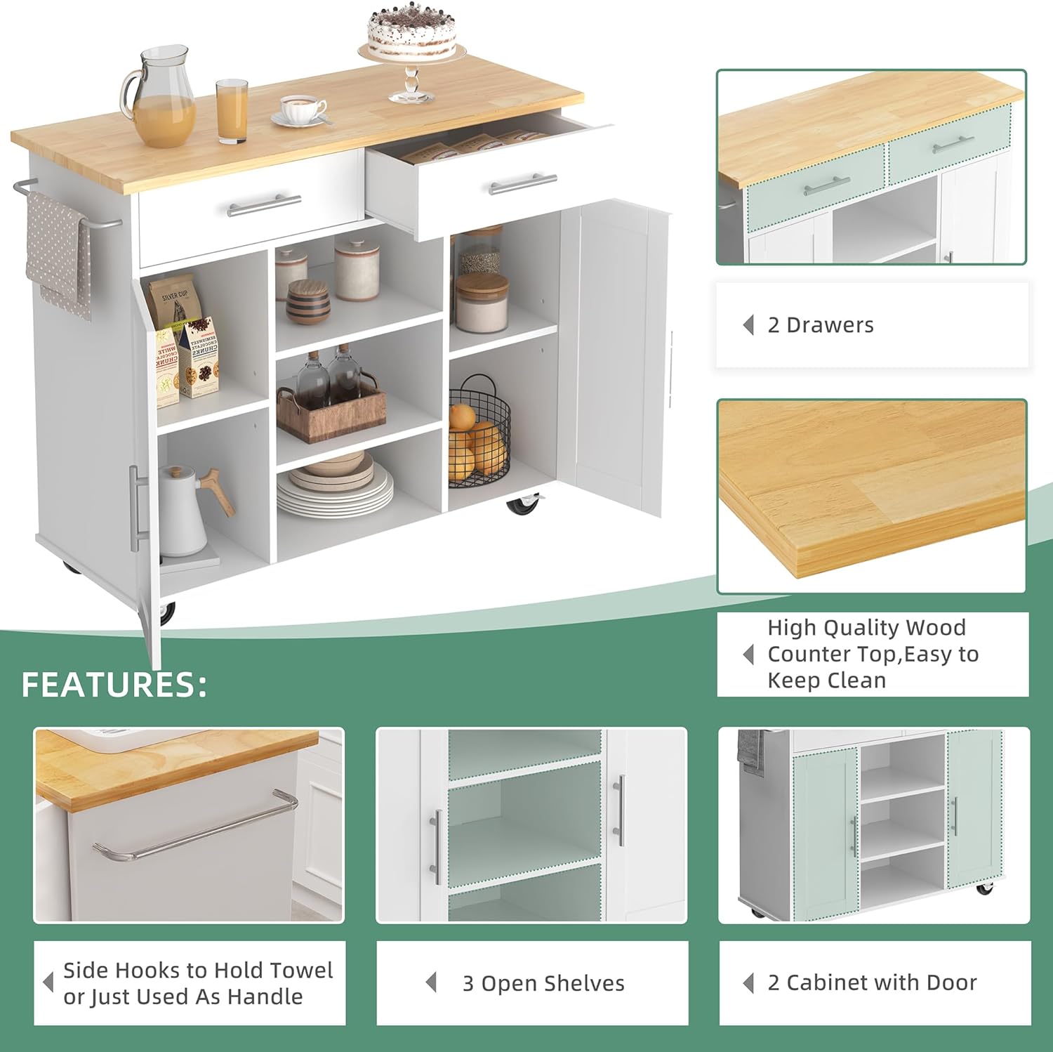 Shintenchi Kitchen Island with Storage, Kitchen Island Cart on Wheels with 3 Open Shelves, 2 Drawers and 2 Cabinets, Rolling Kitchen Table with Large Countertop, White