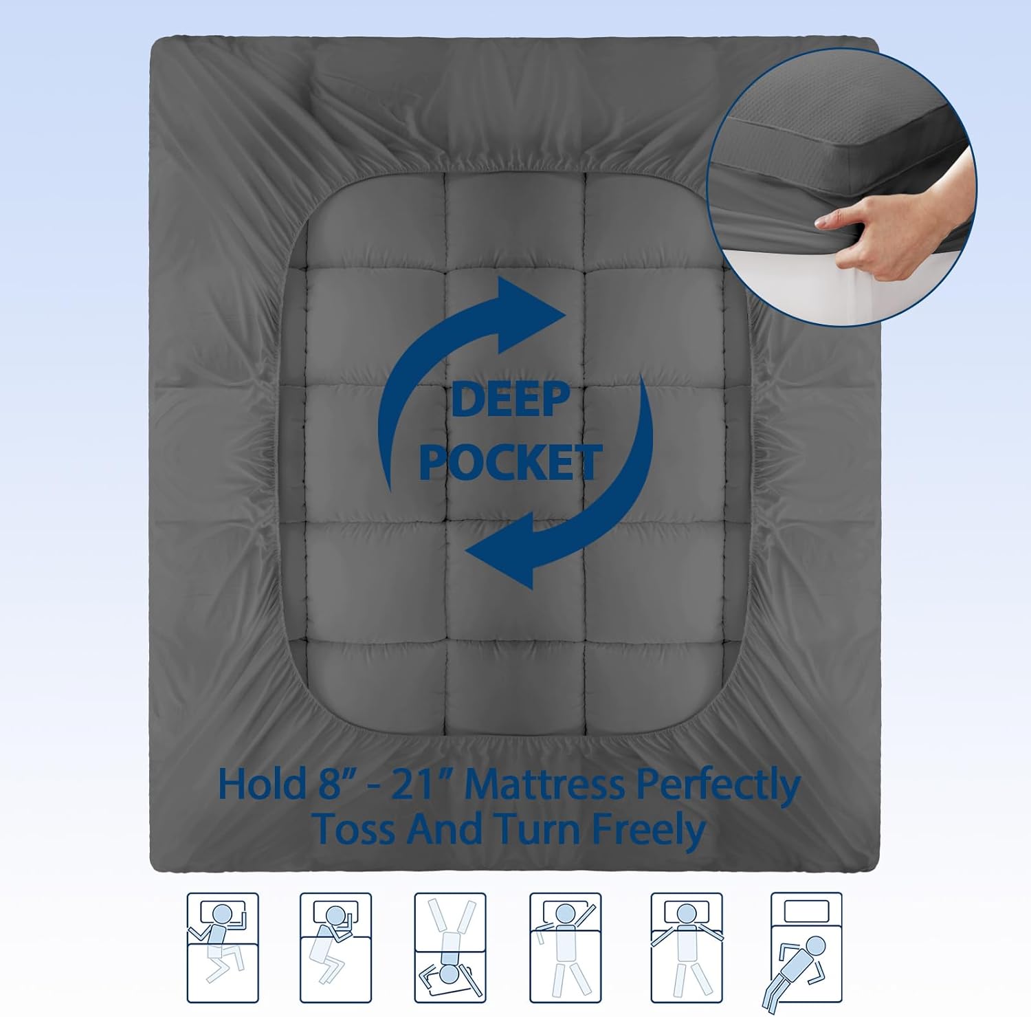 ELEMUSE Queen Grey Cooling Bamboo Viscose Mattress Topper for Back Pain, Extra Thick Mattress Pad Cover, Plush Soft Pillowtop with Elastic Deep Pocket, Overfilled Down Alternative Filling