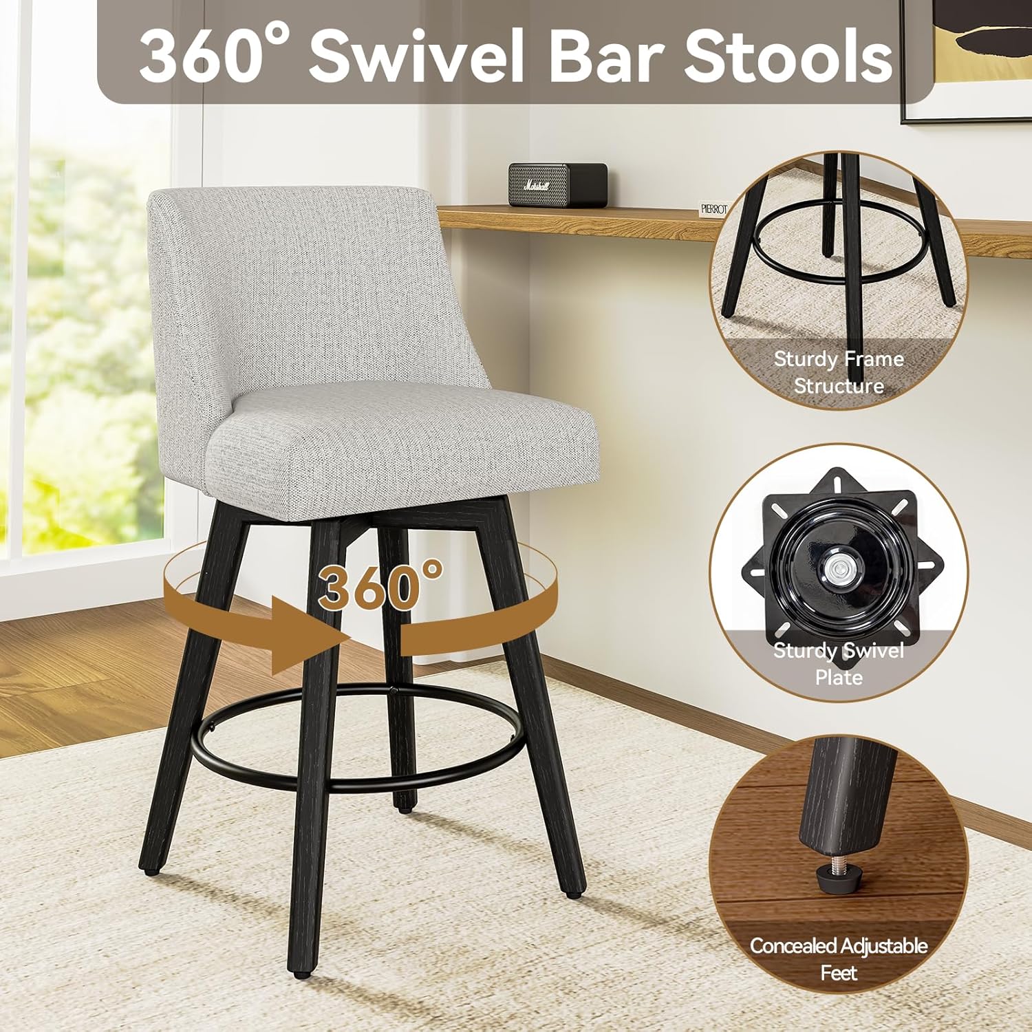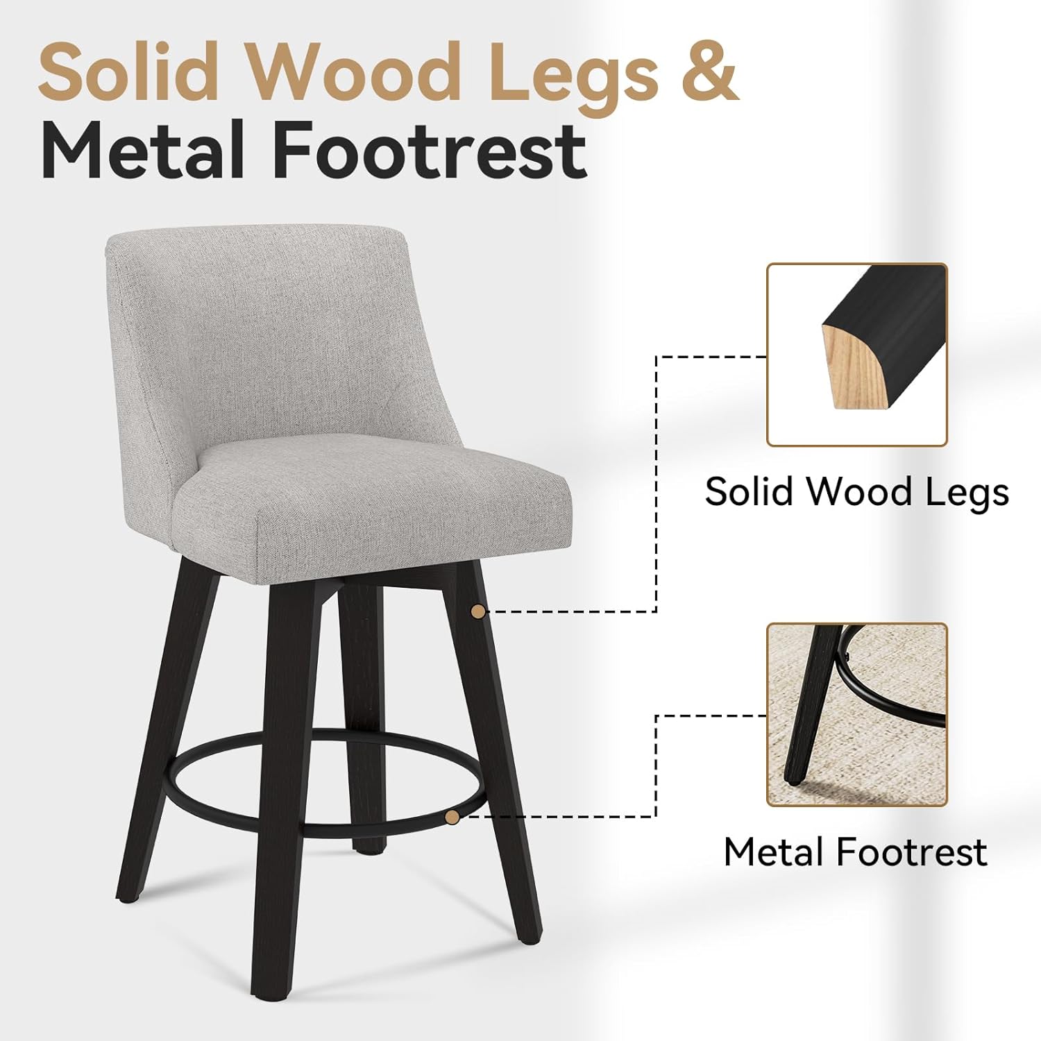 - ăSturdy & Stylish Constructionă Crafted from solid wood with reinforced legs and a built-in footrest, each bar stool supports up to 300 lbs and offers long-term durability. The minimalist modern design complements both traditional and contemporary home decor.