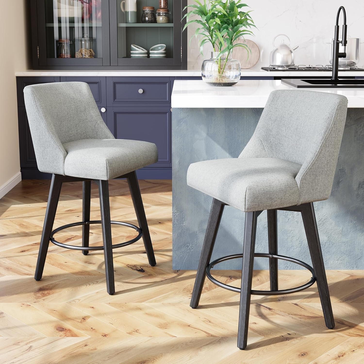 26.8 Inch Counter Height Bar Stools with Back, Swivel Bar Stools Set of 2, Modern Kitchen Barstools with Footrest, Linen Upholstered Bar Chairs, Solid Wood Legs for Island, Pub, Light Grey