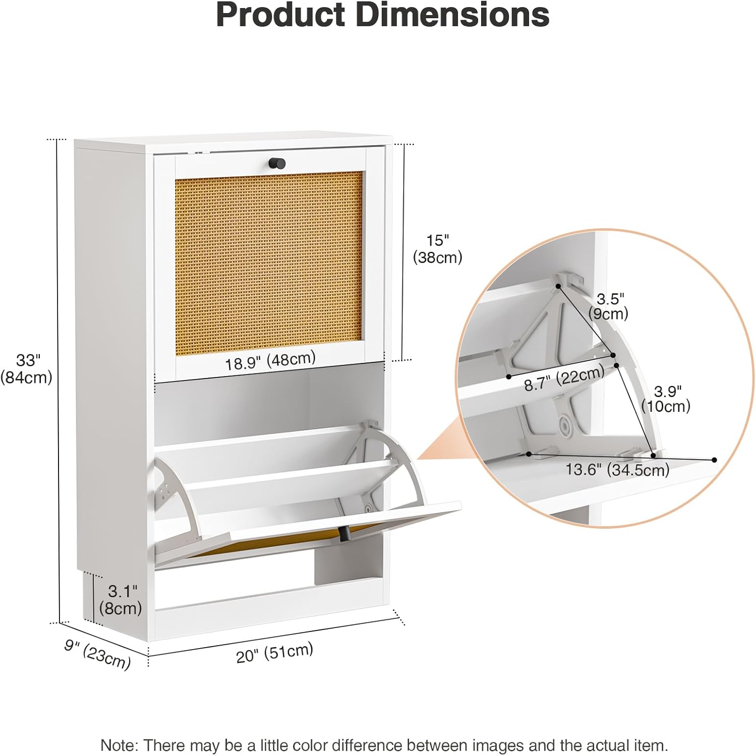 - 2-Tier & Flexible Storage - The shoe cabinet measures 9''D x 20''W x 33''H. It can hold about 8-12 pairs of shoes. The shoe cabinet has 2 compartments with flip drawers,each layer with adjustable or removable shelves for meeting your various shoe storage needs,like flat shoes, sports shoes, boots and high heels can all be stored.