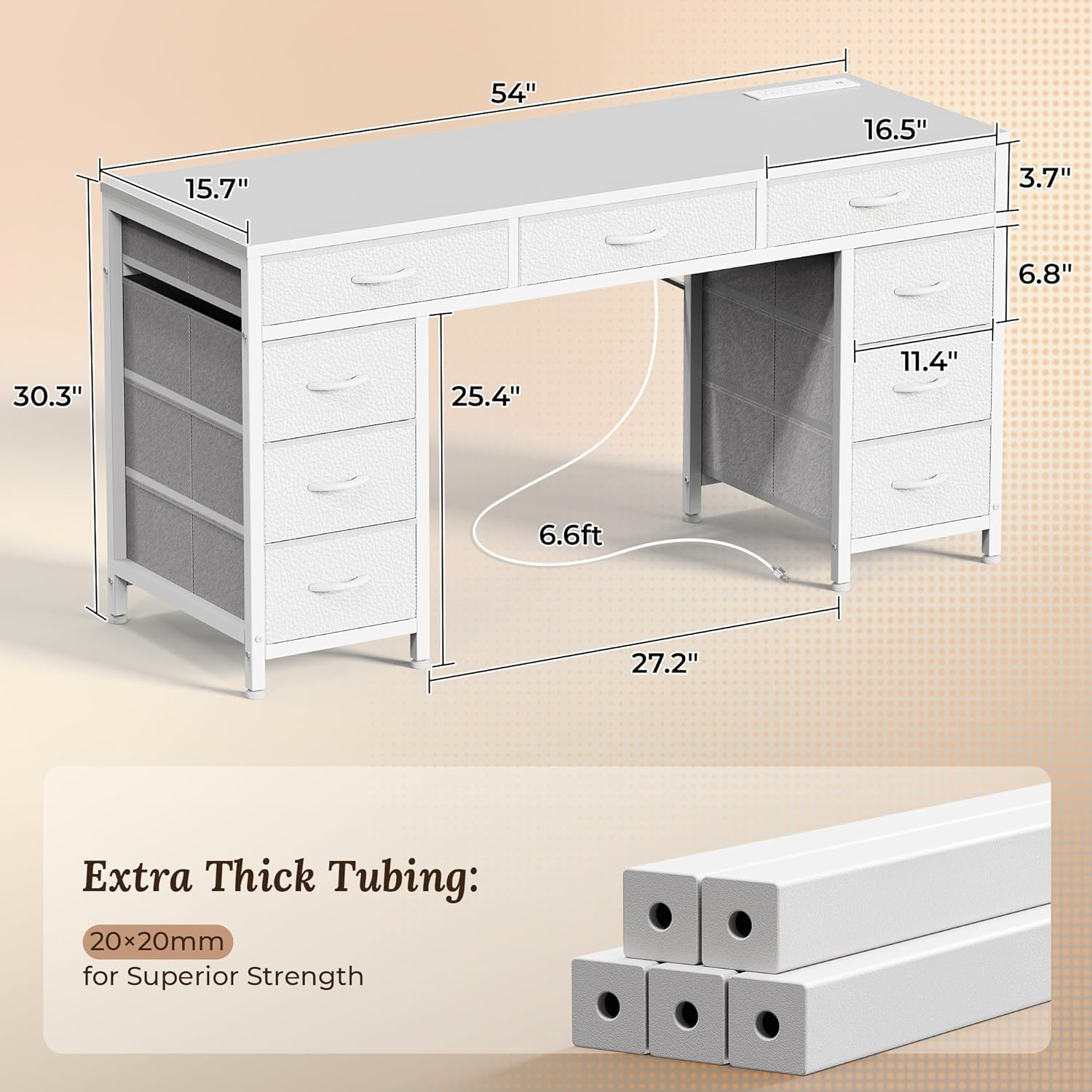 PRAISUN 54 Inch Office Desk with Outlets, Computer Desk with 9 Fabric Drawers, Writing Gaming Work Study Desk for Bedroom, Living Room, Home Office, Large Storage, White