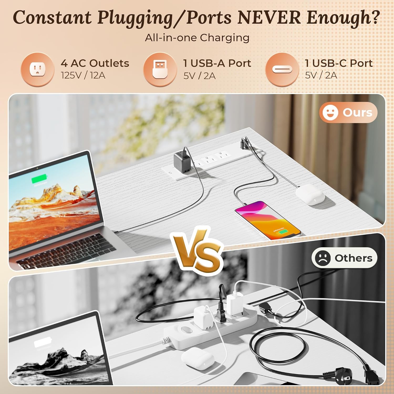 - 【Home Office Desk with Charging Station】No more crawling under the desk for plugs. This PC desk for home office includes 4 AC outlets, 1 USB-A port, and 1 USB-C port, perfect for powering everything from your laptop and monitor to your phone, tablet, or desk lamp. Charge everything without leaving your seat with this study desk